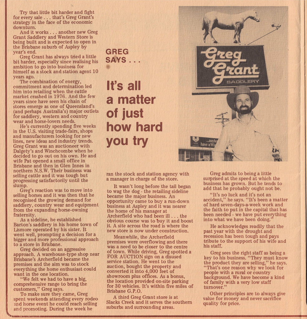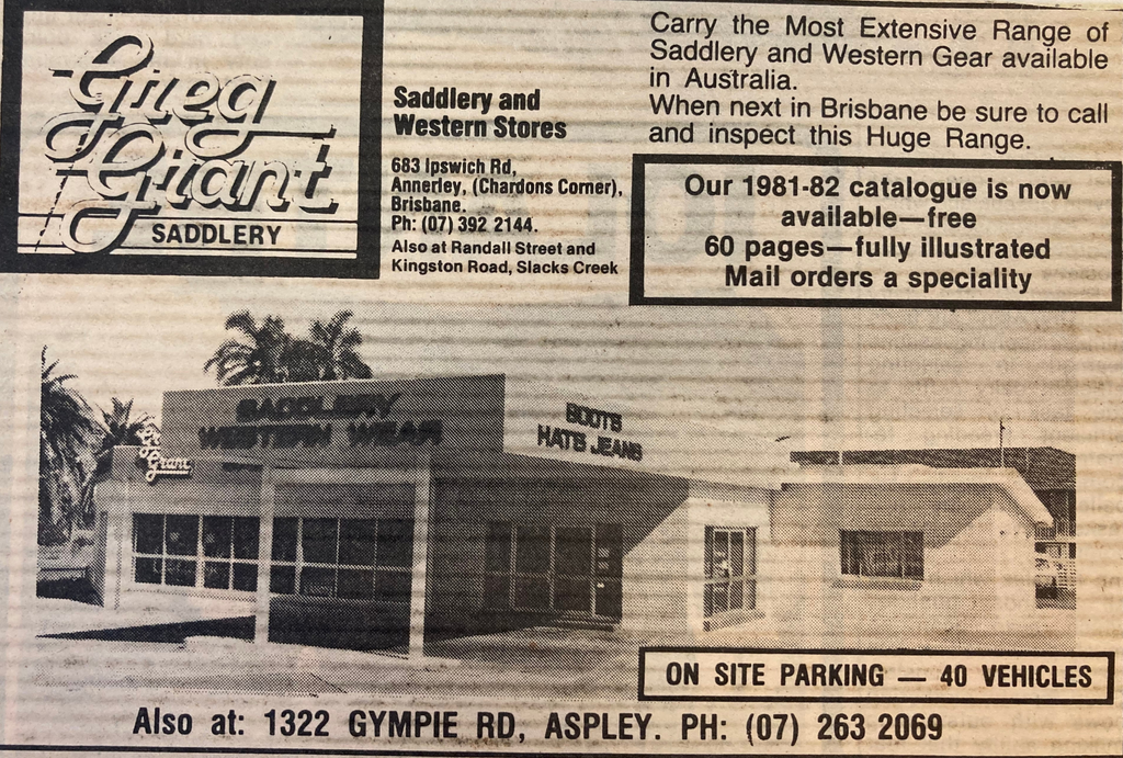The Annerley store opened in 1980, and the Aspley store was renamed to Greg Grant Saddlery.