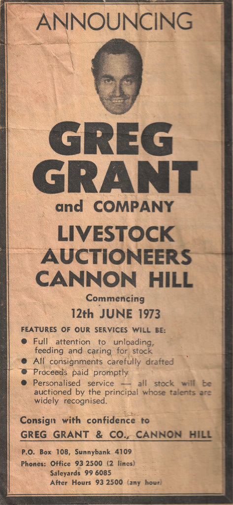 Greg Grant started his career as a stock and station agent at Dalgety’s in Sydney. He then moved to Brisbane and joined the team at Winchcombe Carson in Brisbane. Greg’s outstanding talent continued to earn him big success within the industry, and by the early 1970s, he and his wife Patricia decided to launch their own agency selling livestock at Cannon Hill in Brisbane.