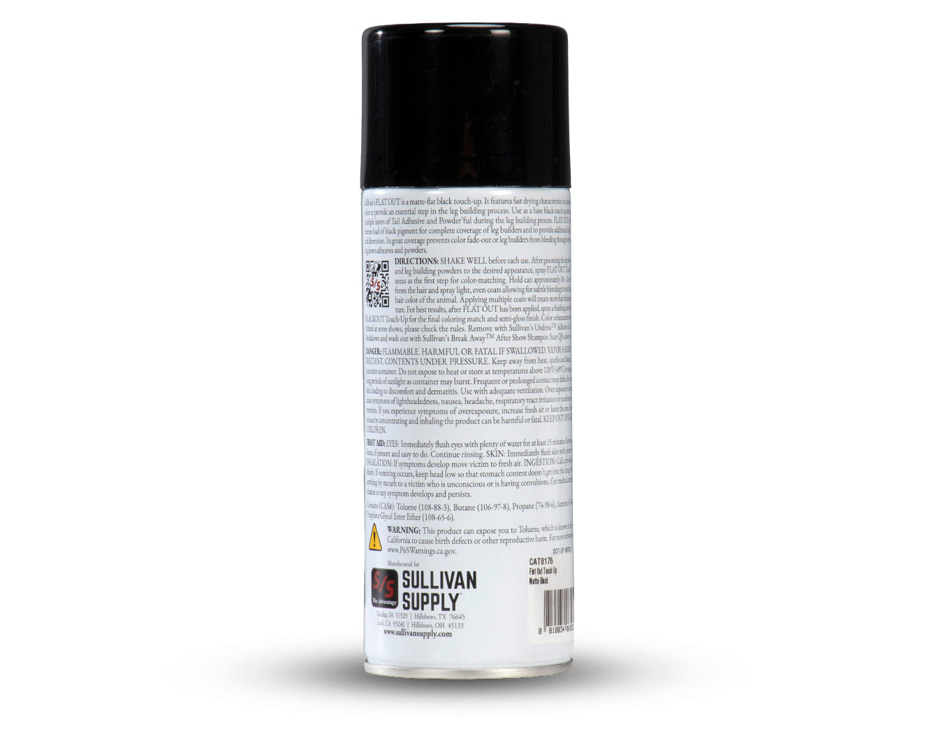 Sullivan's Flat Out is a fast-drying matte black touch-up paint designed for livestock leg building. It delivers a medium black colour with intense pigment that provides excellent coverage, texture, and natural hair-like finish. Perfect for covering adhesives and leg builders, it prevents colour fade and bleeding without breaking down adhesive layers. Sullivan's Flat Out enhances the depth and dimension of the coat, making it an essential product for show animals