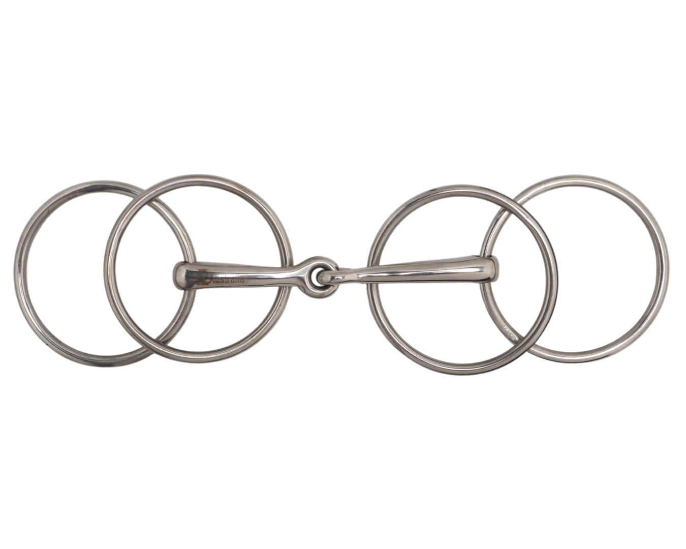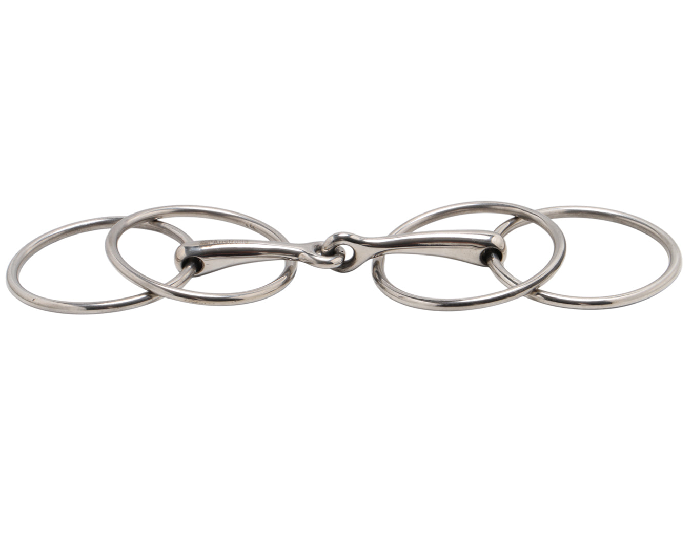 The Wilson Snaffle is traditionally used in the driving world, but is also becoming popular for ridden horses. It has four loose rings - two attached to each end of the mouthpiece, with two additional "inside rings". The cheek pieces of the bridle are fitted to the inside rings, while the reins are fitted to the outside two rings. The bits works with a squeezing action on the horse's cheeks rather than on the corners of the mouth. The Wilson Snaffle can give superb control and "turning power" for a hard-pulling horse, while not being overly severe.