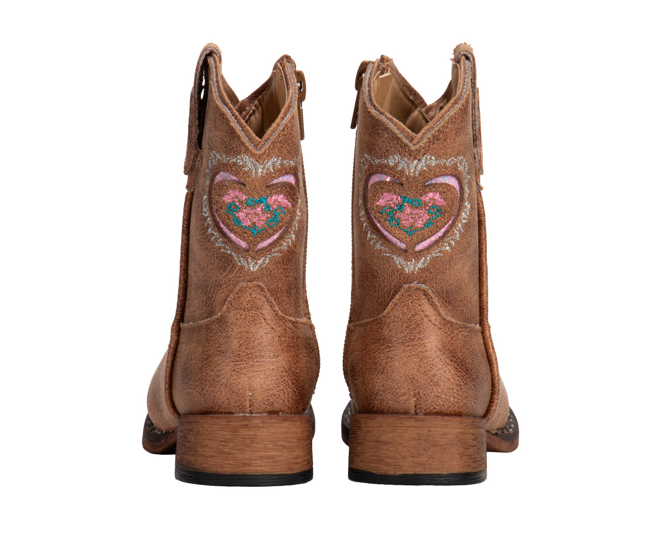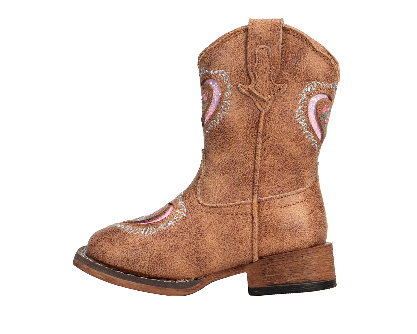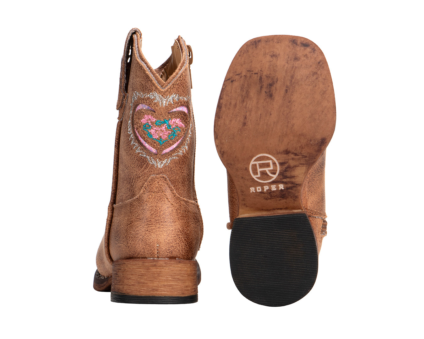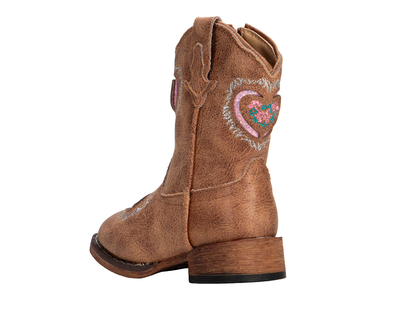 Discover the perfect blend of style and comfort with the Roper Heartful Brown Toddler Boot. Crafted from vintage tan faux leather, these boots feature a charming glitter heart inlay with delicate embroidery, ideal for little western enthusiasts. The flexible TPR sole and padded cushioned insole ensure all-day comfort for growing feet, while the 6-inch side zip shaft allows easy on and off. Designed with a wide square toe and a sturdy 1-inch heel, these boots combine practicality with adorable detailing.