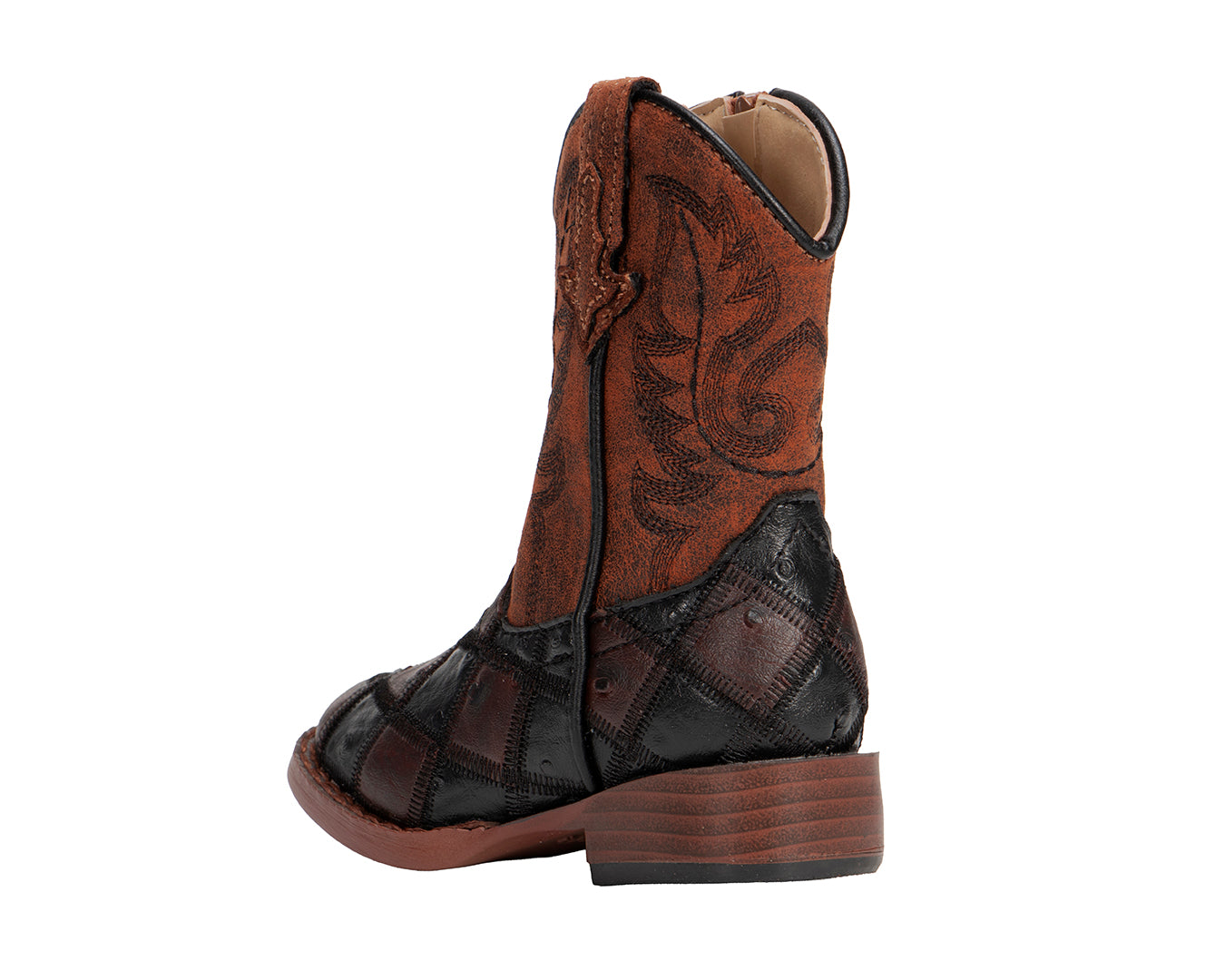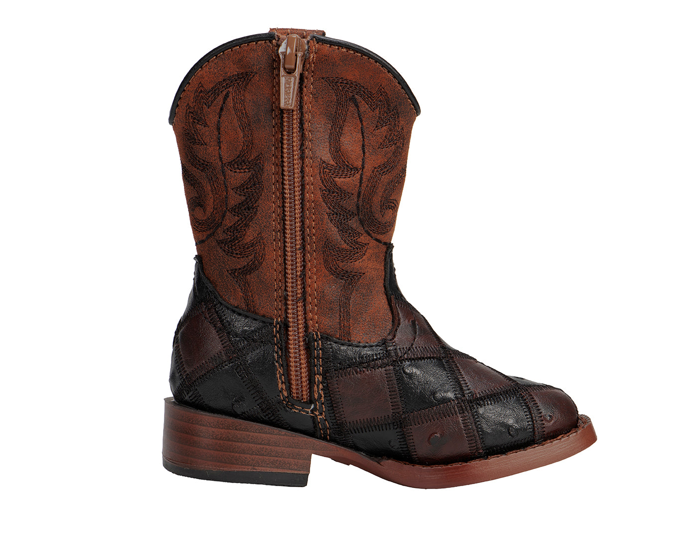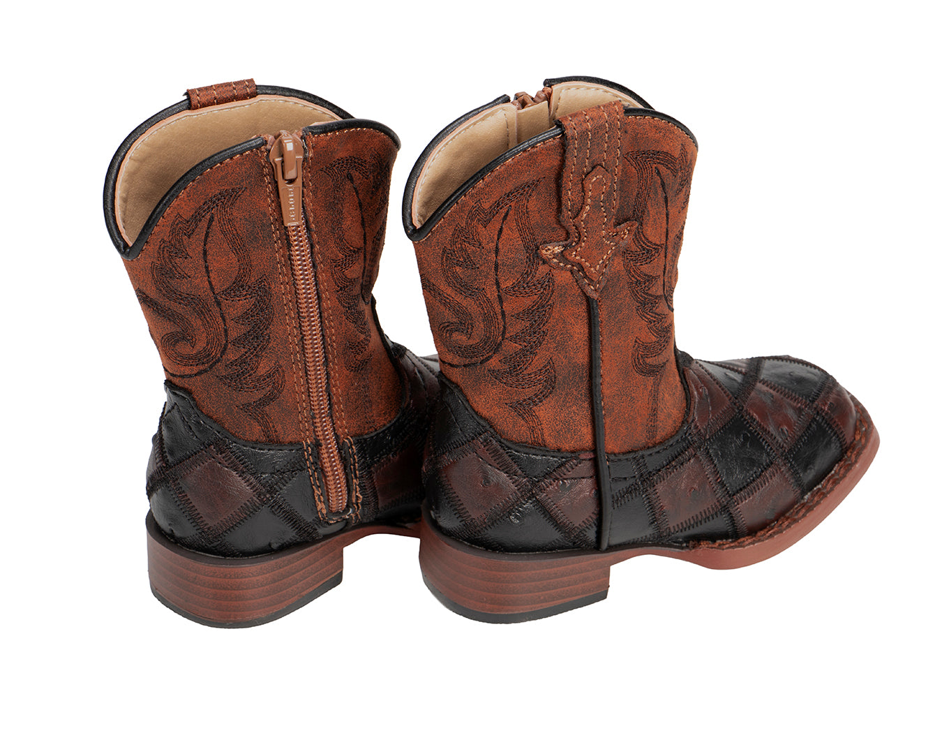 Let your little one step out in western style with the Roper Toddler Cowbaby Bird Block Boots. Made with a faux ostrich brown and black patchwork vamp and a vintage brown faux leather shaft, these boots are as stylish as they are practical. Designed with a 6-inch side zip shaft and inside zipper, they’re easy to pull on and off, making them perfect for active toddlers. The wide square toe, fabric lining, and flexible bottom deliver lasting comfort, while the 1-inch heel adds a touch of authenticity.