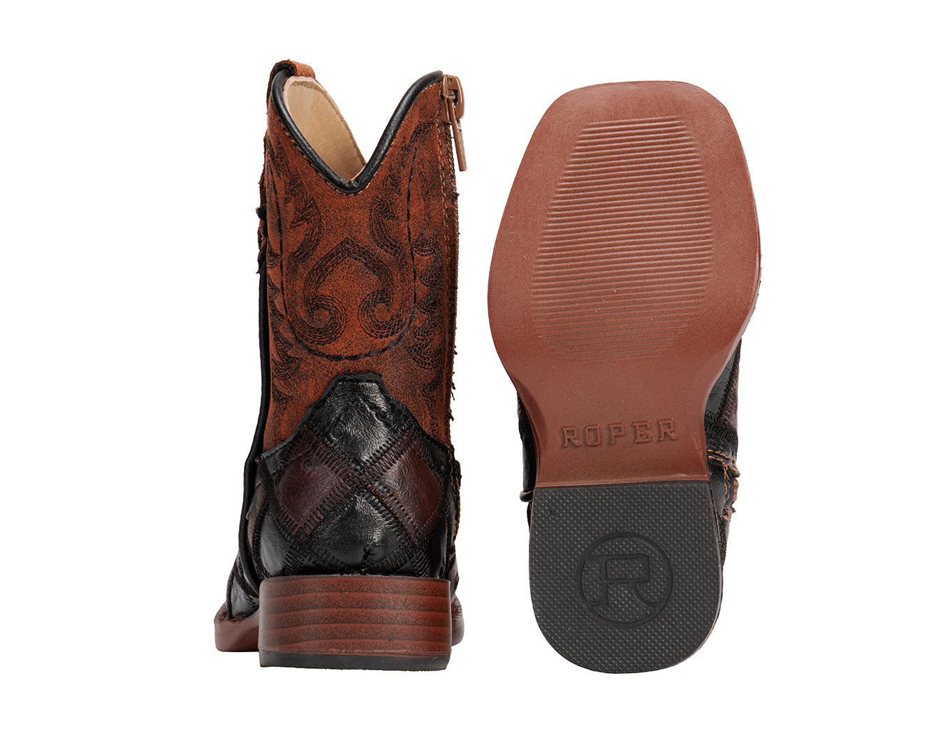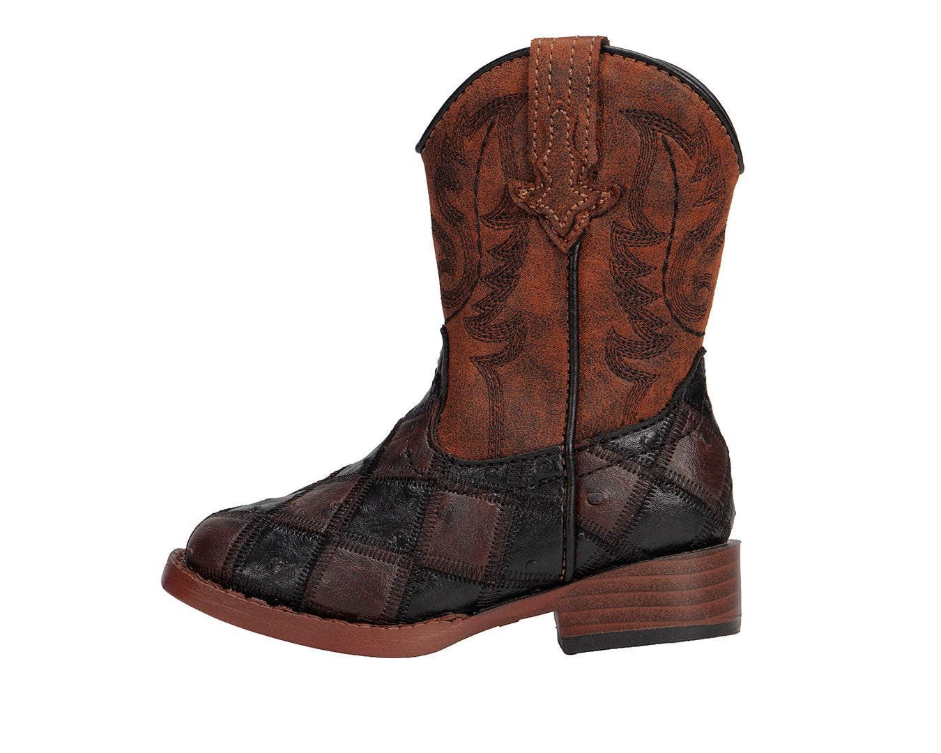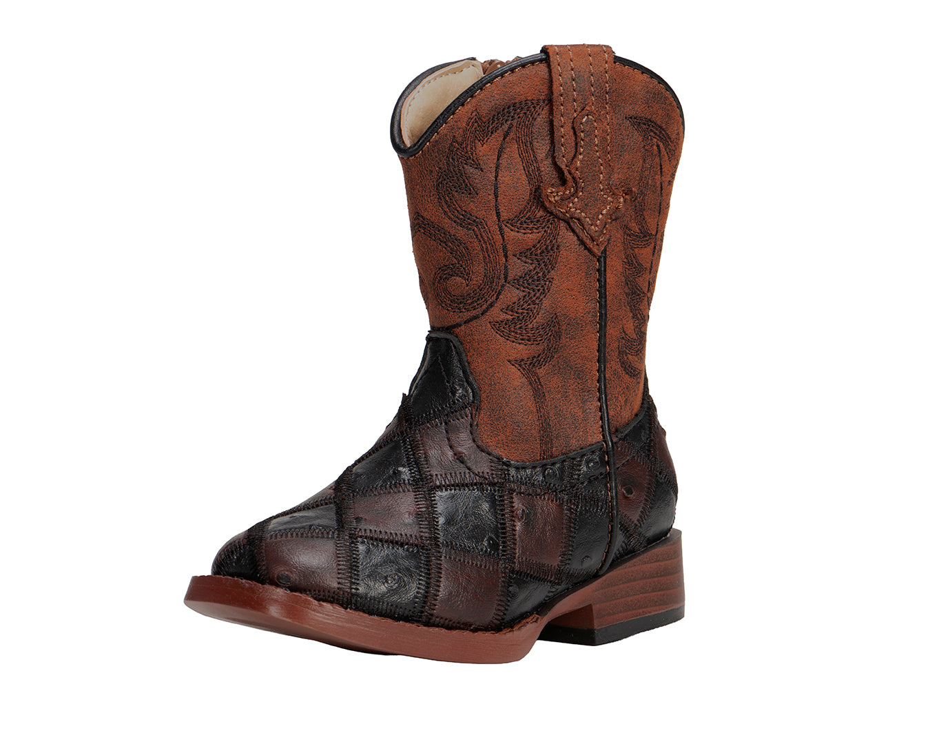 Let your little one step out in western style with the Roper Toddler Cowbaby Bird Block Boots. Made with a faux ostrich brown and black patchwork vamp and a vintage brown faux leather shaft, these boots are as stylish as they are practical. Designed with a 6-inch side zip shaft and inside zipper, they’re easy to pull on and off, making them perfect for active toddlers. The wide square toe, fabric lining, and flexible bottom deliver lasting comfort, while the 1-inch heel adds a touch of authenticity.