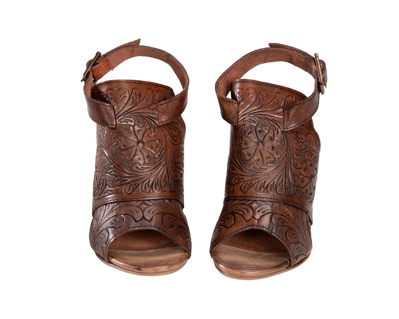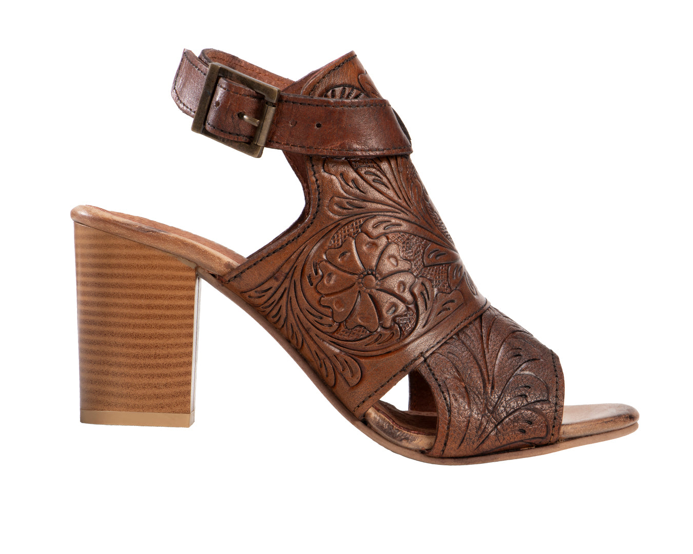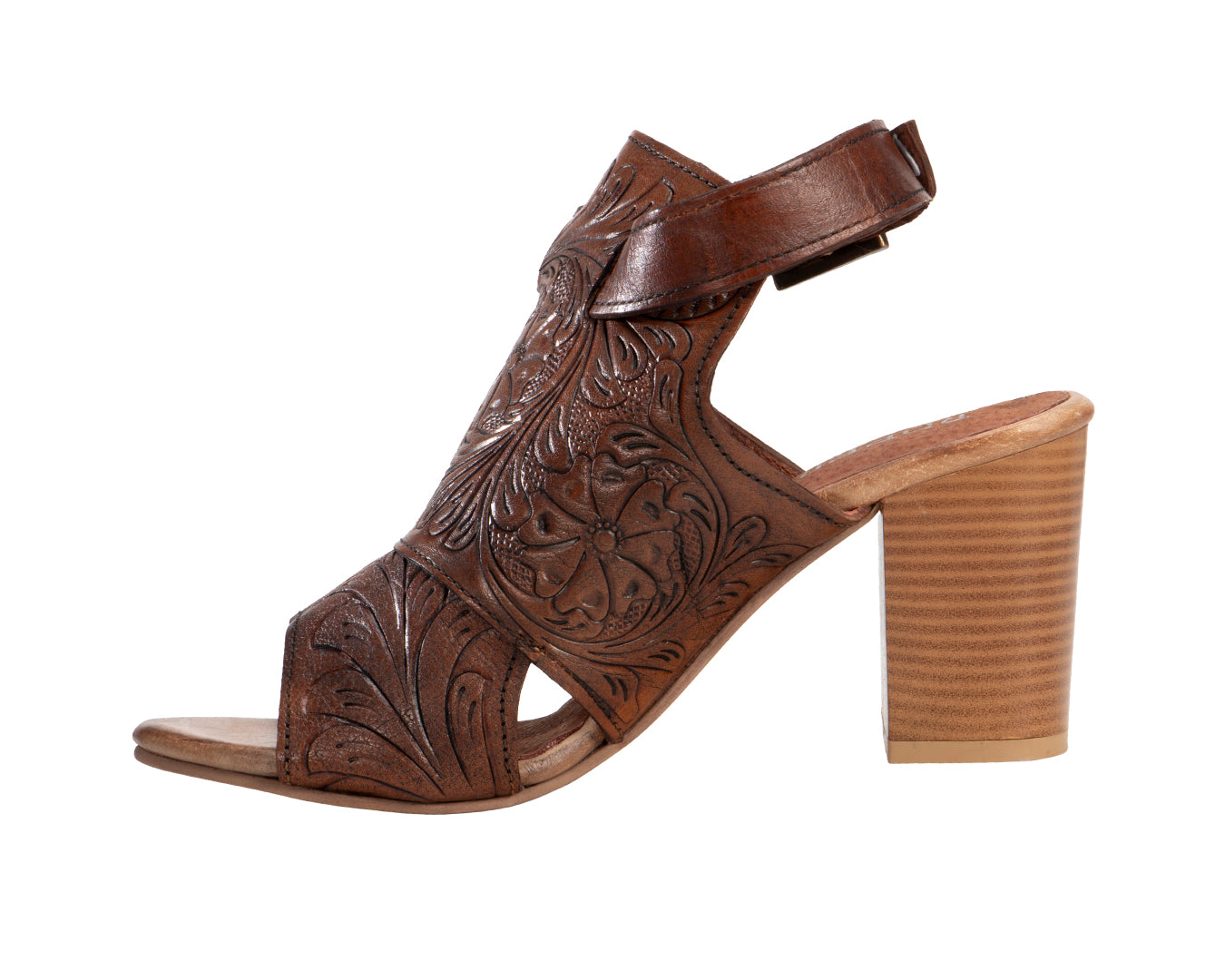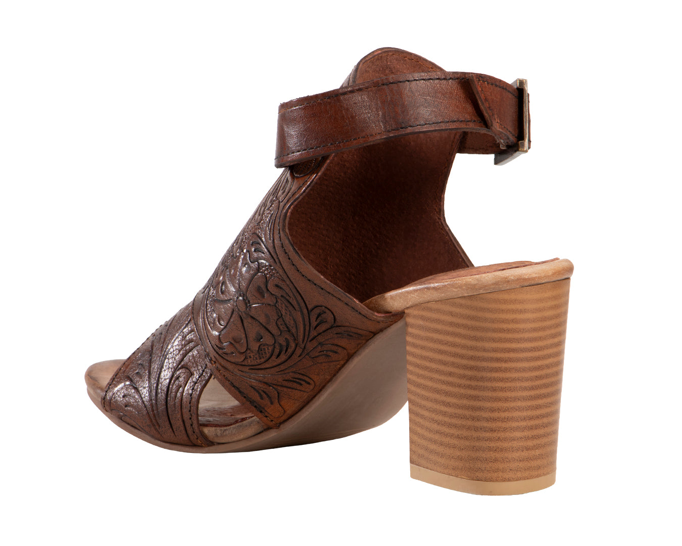 Discover the perfect blend of style and comfort with the Roper Women's Mika Back Strap Sandal. Crafted from genuine tan floral tooled leather featuring a painted tooled design on the upper, this sandal boasts a 3-inch fashion heel with a flexible TPR sole for all-day wearability. The open toe and back strap with antique brass buckle ensure a secure fit, while the padded insole and pig suede lining deliver exceptional cushioning. Ideal for casual outings or dressy occasions, explore a sandal that combines timeless Western style with modern comfort.