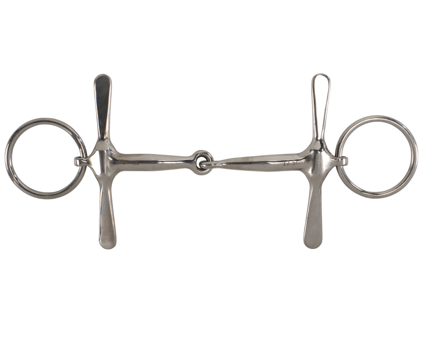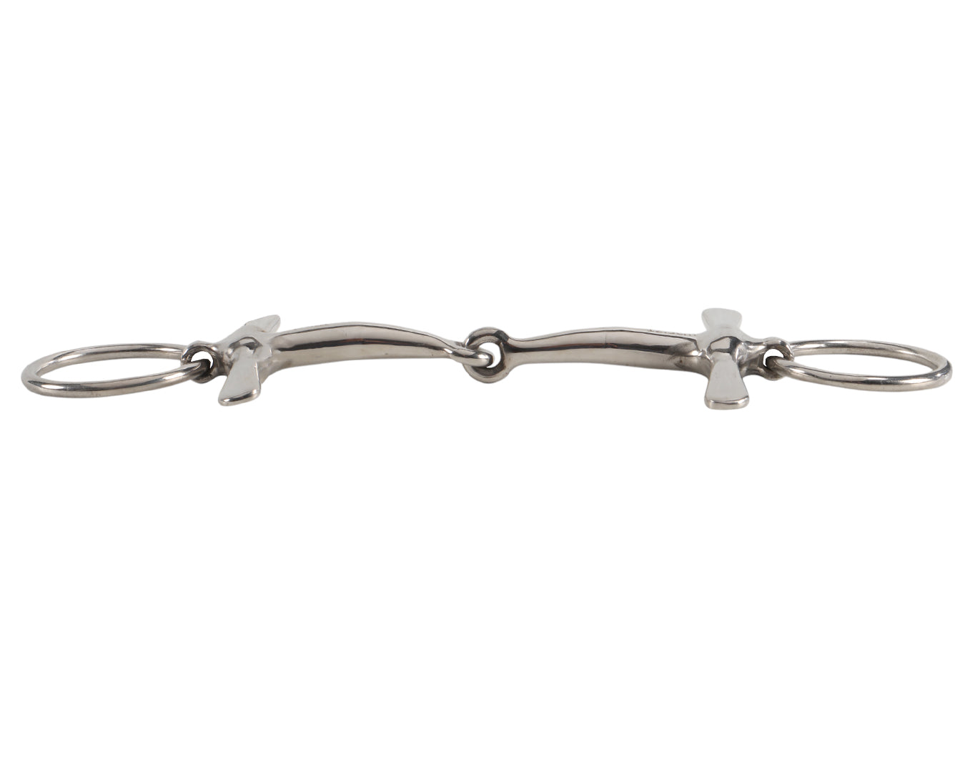 The Equisteel SS Tom Thumb Snaffle Bit is an economically priced bit designed for horses and riders looking for a reliable and durable option. It is made from stainless steel, ensuring it does not rust and offers long-lasting performance. This bit features a jointed snaffle mouth with loose rings and 4" side bars (wings), which help prevent the bit from being pulled through the horse’s mouth, assist with steering, and apply lip pressure when reins are used. It is suitable for ponies and smaller horses and is especially popular as an all-round bit for beginners and young horses. The stainless-steel construction gives it a clean, smooth finish and ensures durability.