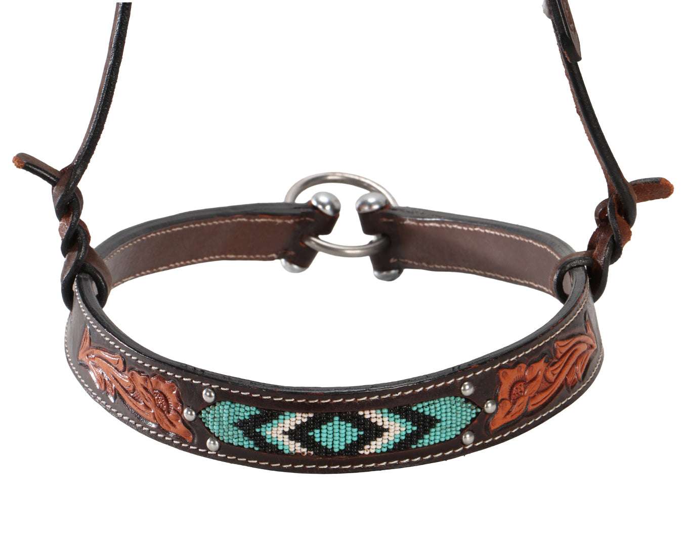 The Fort Worth Turquoise Beaded Noseband is a premium, handcrafted noseband made from high-quality American leather sourced from the world's finest tanneries. It features exquisite turquoise beaded accents set into richly carved leather, offering a striking contrast and an elegant Western style.