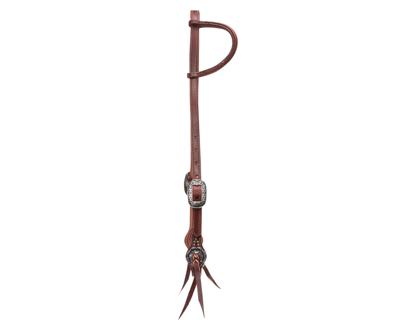 The Weaver Work Tack JW Sliding Ear Headstall is crafted from premium harness leather that is carefully dipped in oil, dressed with saddle butter, and hand-rubbed to achieve superior durability and a rich golden chestnut color.