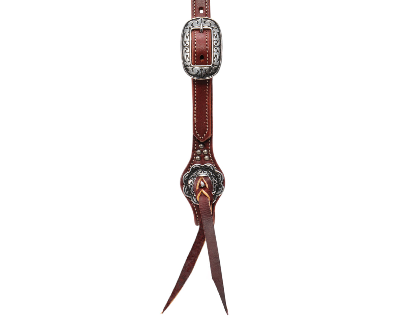 This headstall features a rugged design ideal for working or training horses, combining both function and an attractive appearance. It includes non-rust hardware, contributing to its longevity and performance in various working conditions.