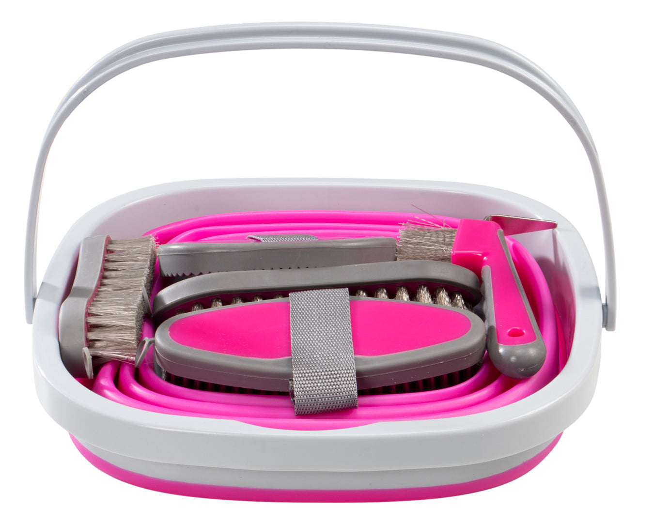 Discover the ultimate everyday horse grooming kit with a handy collapsible bucket for easy storage. This kit includes all essential brushes, combs, and a hoof pick, featuring a durable and stylish design in vibrant pink with grey trim. Ideal for competitions, pony club or at-home care, it’s tough, lightweight, and fuss-free for transport. The bucket folds flat for space-saving convenience, keeping gear tidy at all times.