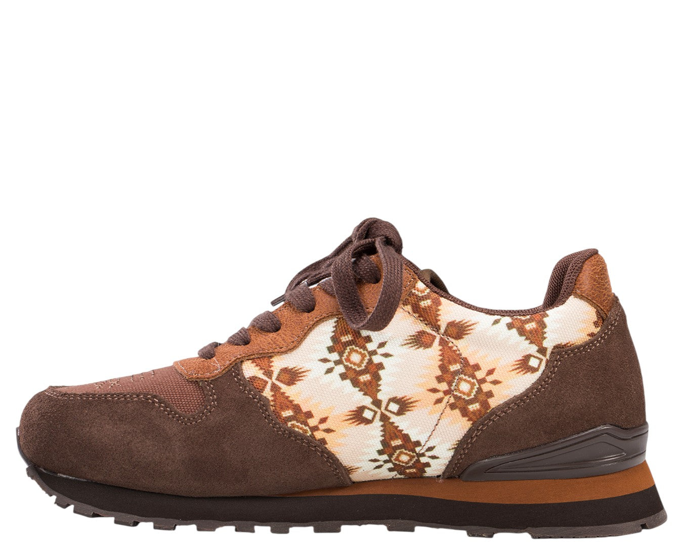 Discover the stylish and comfortable Roper Women's Giddy Up Suede Shoe, featuring rich brown suede with a unique tan Aztec canvas side quarter. Designed for everyday wear, these joggers include a moisture-wicking lining and a removable comfort insole for all-day breathability and support. The EVA midsole coupled with a durable rubber outsole offers lightweight cushioning and reliable grip. Perfect for those who love a blend of classic western style and modern comfort.
