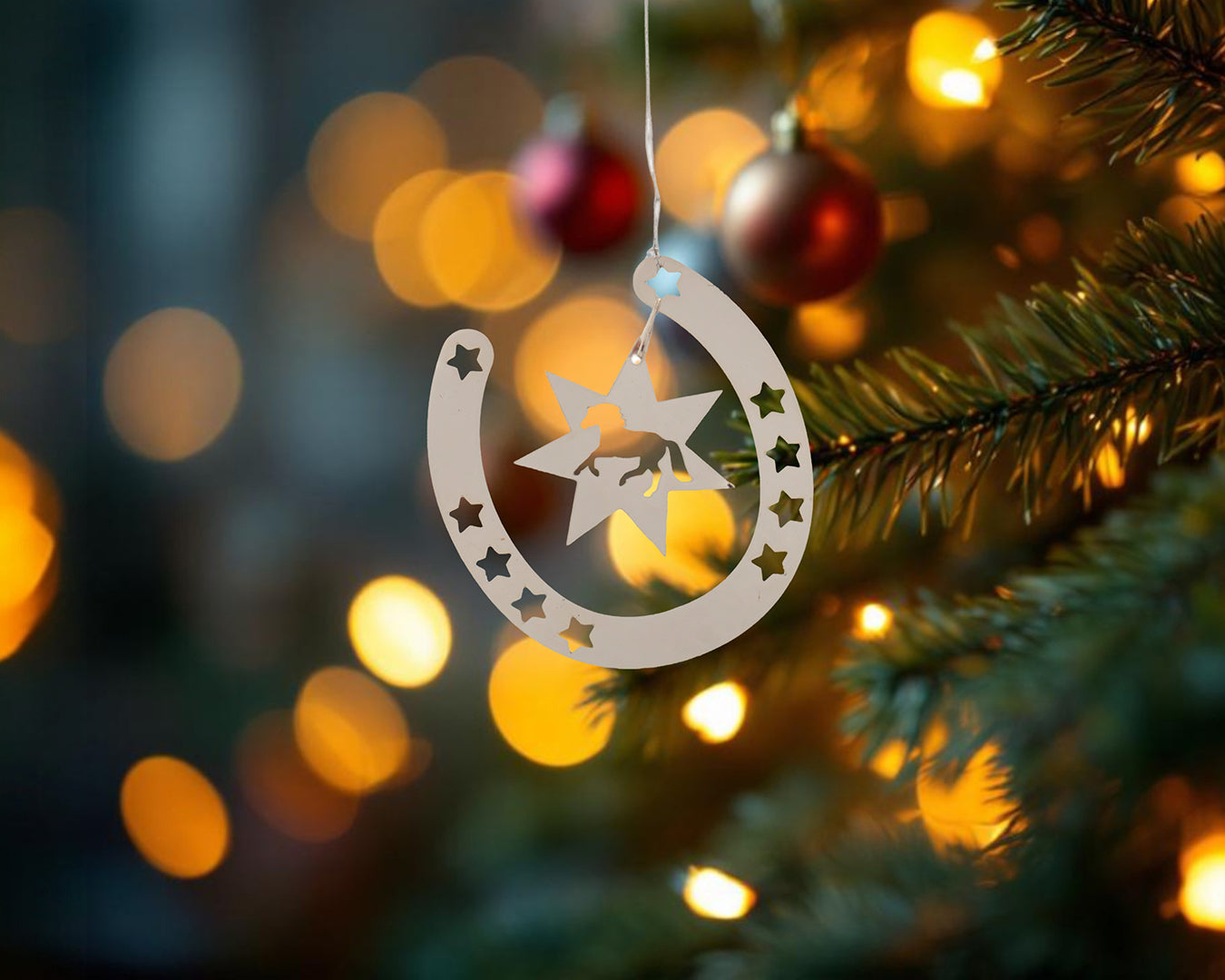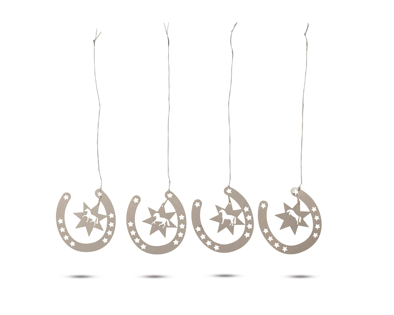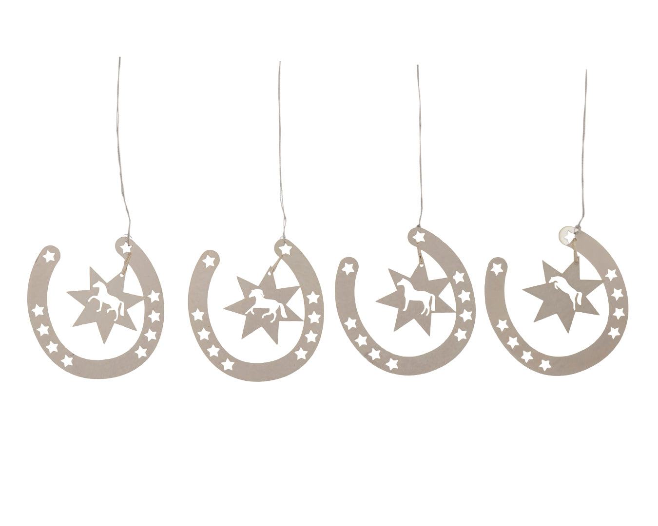 Add a touch of charm to your home or stable décor with the Happy Ross Horseshoe Ornaments in silver. Crafted from shiny steel, these decorative pieces bring rustic elegance to any setting. Each ornament is made from 0.2mm thin steel with a sleek silver finish, offering durability without the bulk. Designed with a handy loop for easy hanging, they’re perfect for Christmas trees, walls, or gift wrapping. This pack of four features unique horse designs, making it an ideal gift for horse lovers or collectors.