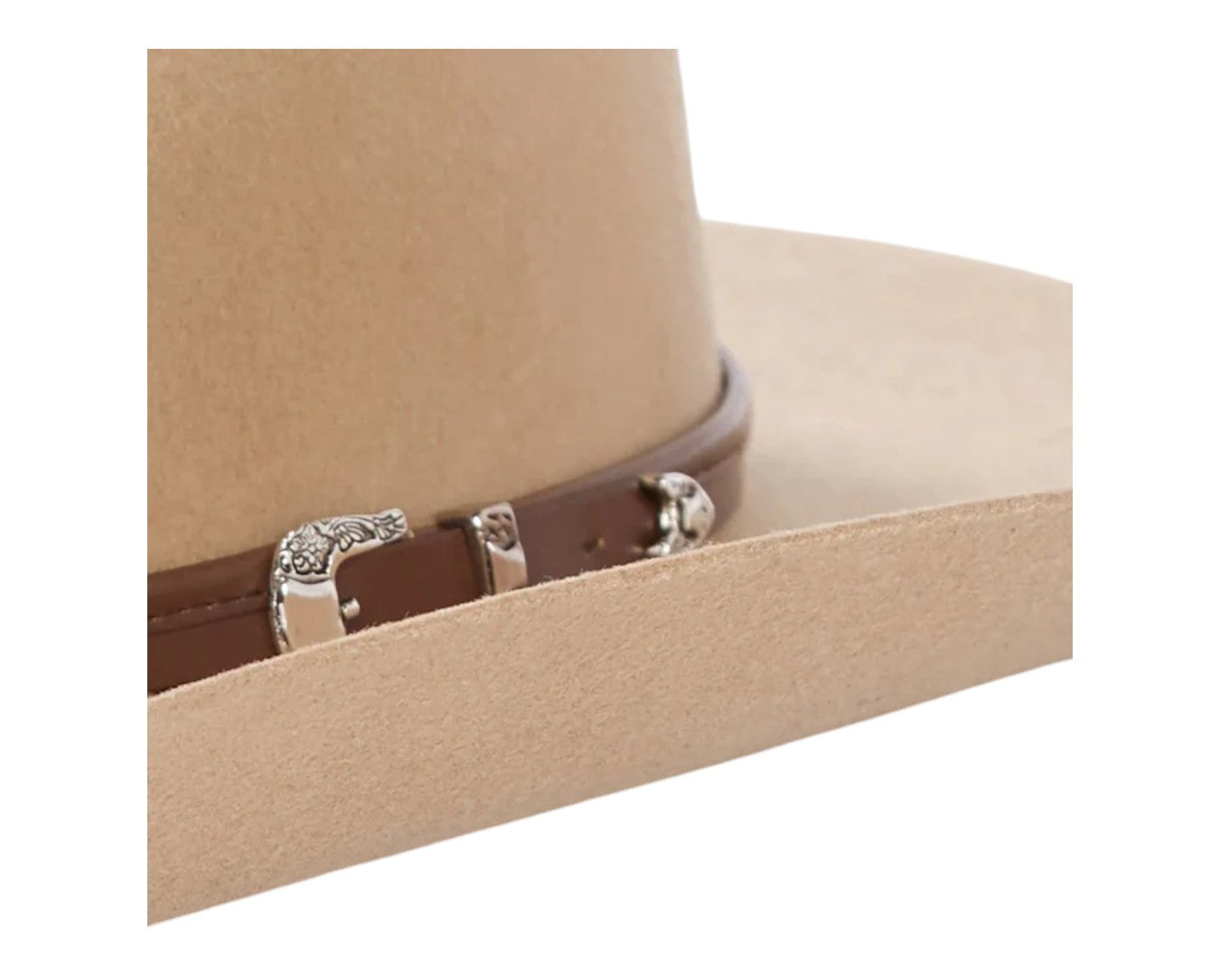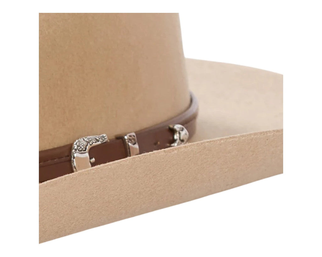 - Tooled Leather Hat Band: Accented with a silver buckle set for added elegance.