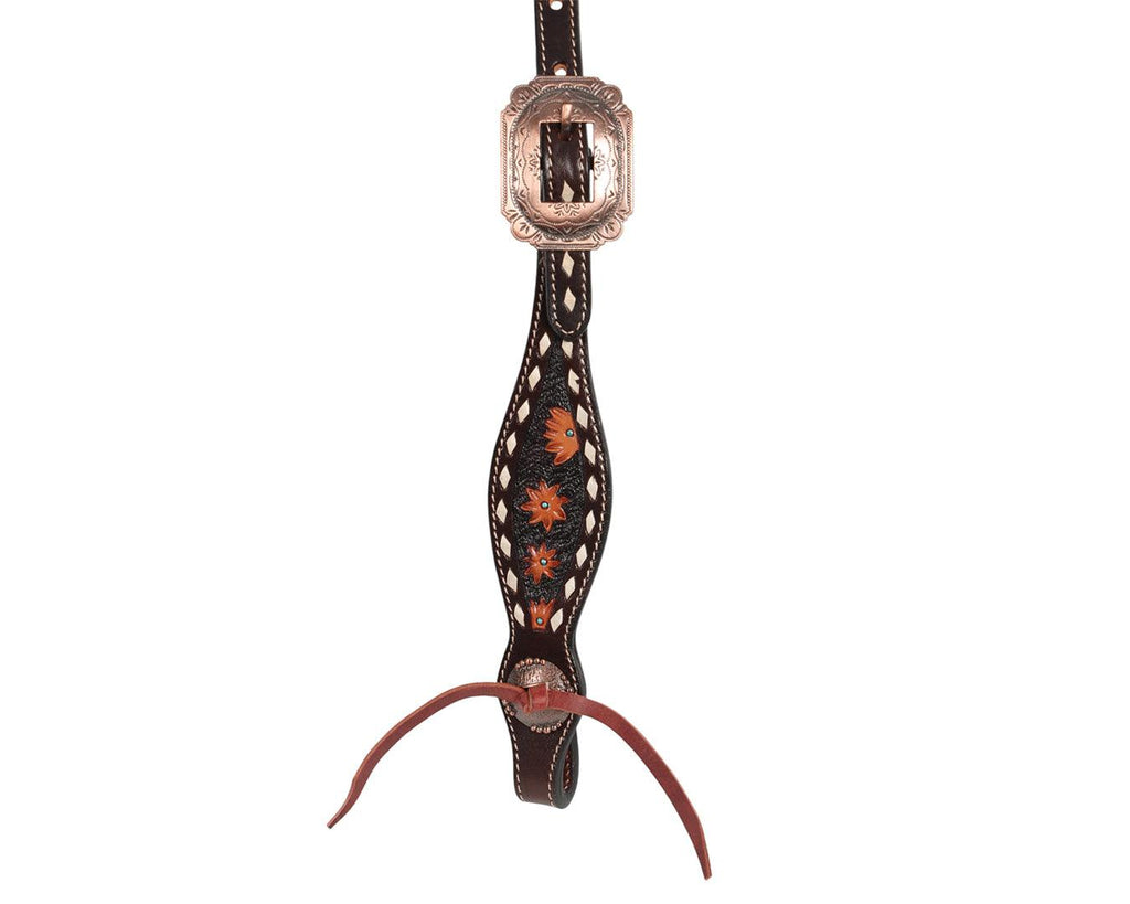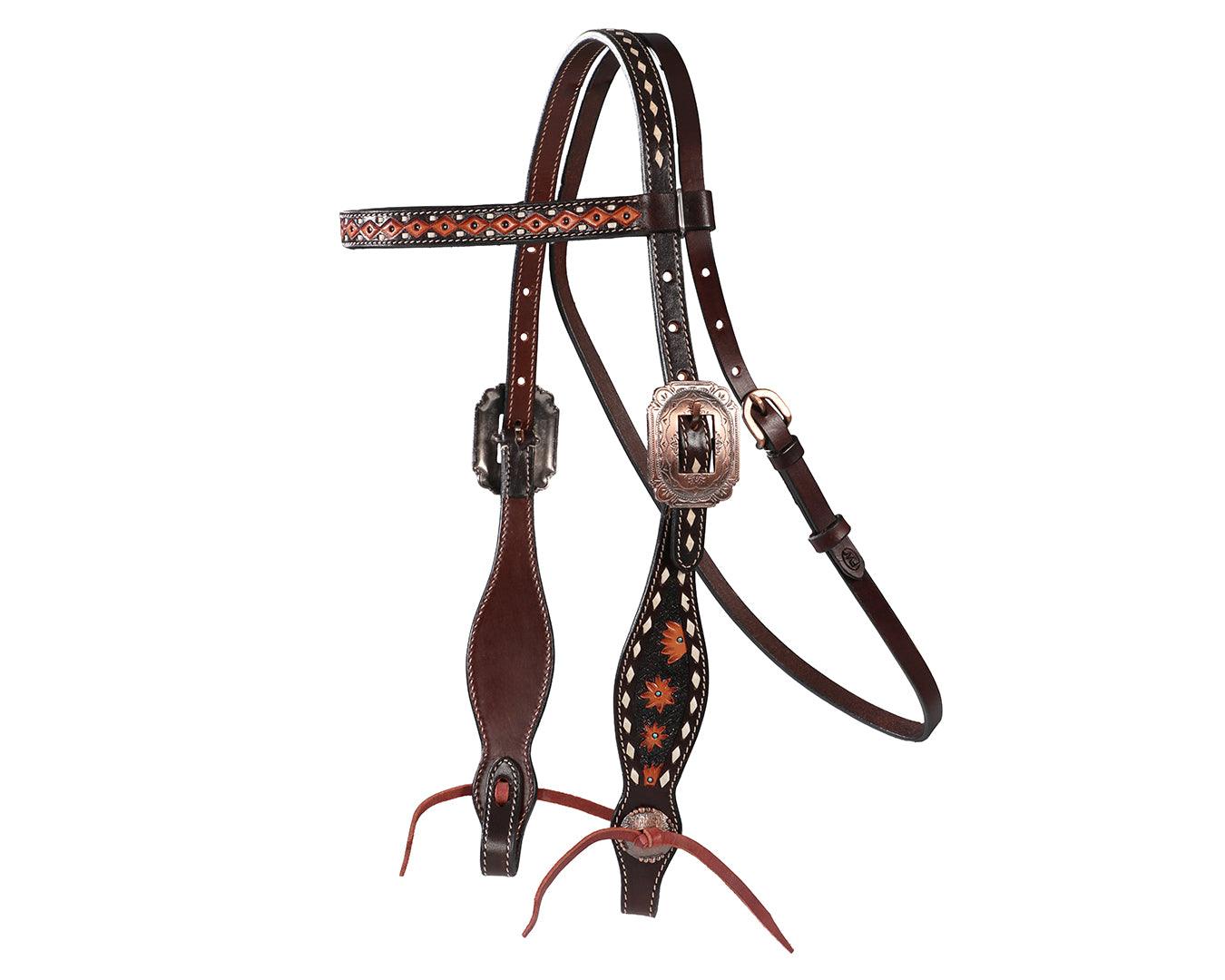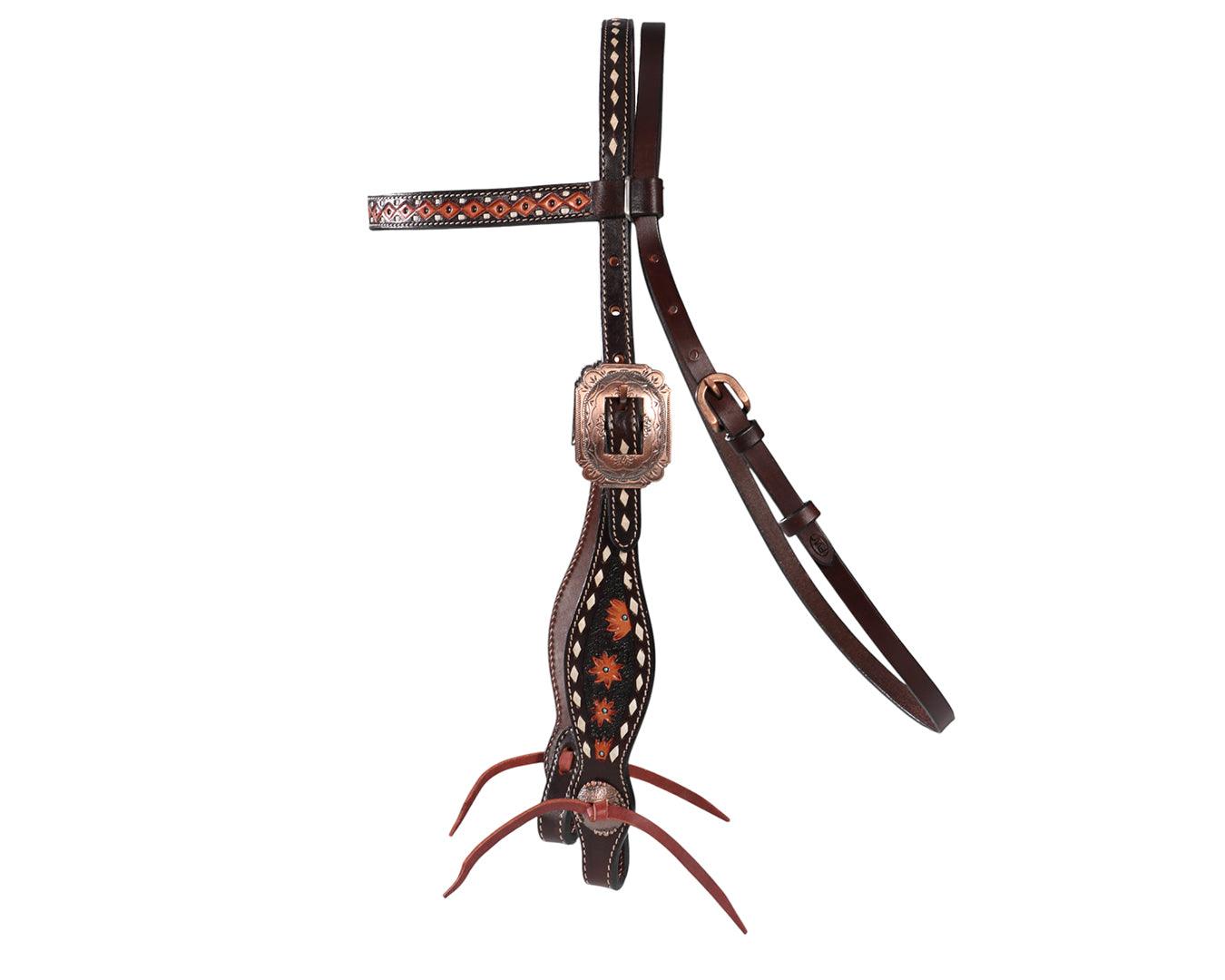The Western headstall of your dreams is here. Part of the striking Prairie Dreams Collection; this headstall is crafted from dark brown quality leather and features a hand-painted and tooled design. Contrasting white buckstitch, copper hardware, and ornate buckles give it a bold, standout look that’s perfect for riders who love unique, statement tack. Matching breastcollar and spur straps complete the set.