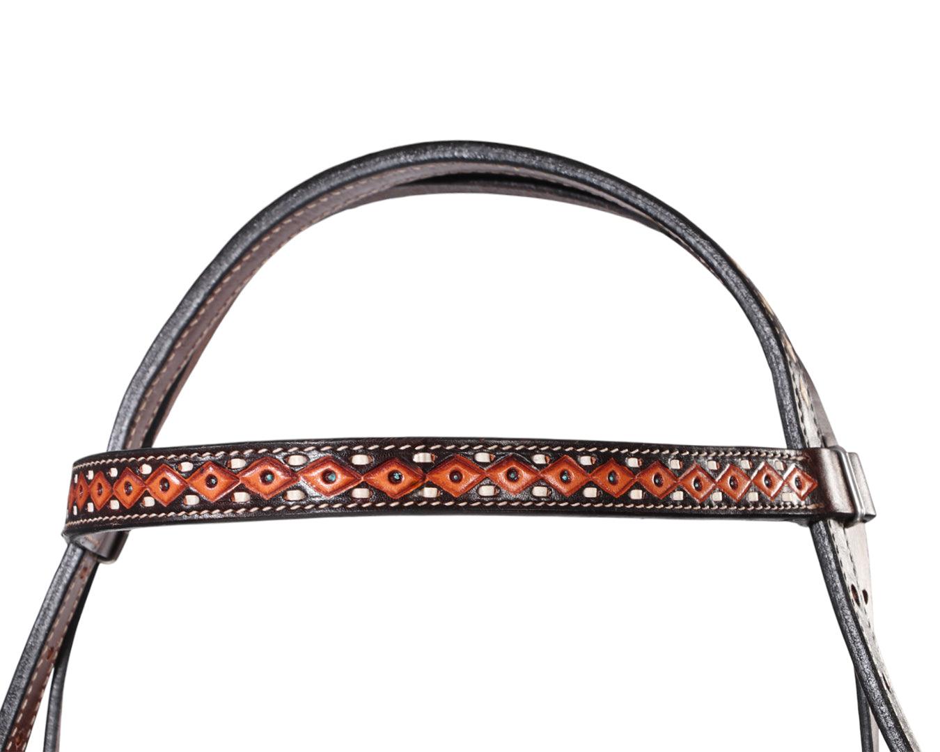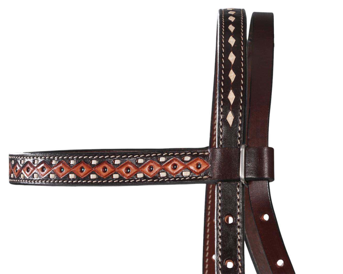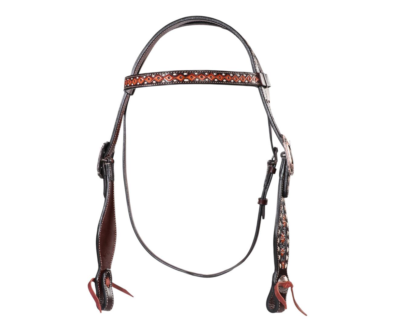 The Western headstall of your dreams is here. Part of the striking Prairie Dreams Collection; this headstall is crafted from dark brown quality leather and features a hand-painted and tooled design. Contrasting white buckstitch, copper hardware, and ornate buckles give it a bold, standout look that’s perfect for riders who love unique, statement tack. Matching breastcollar and spur straps complete the set.