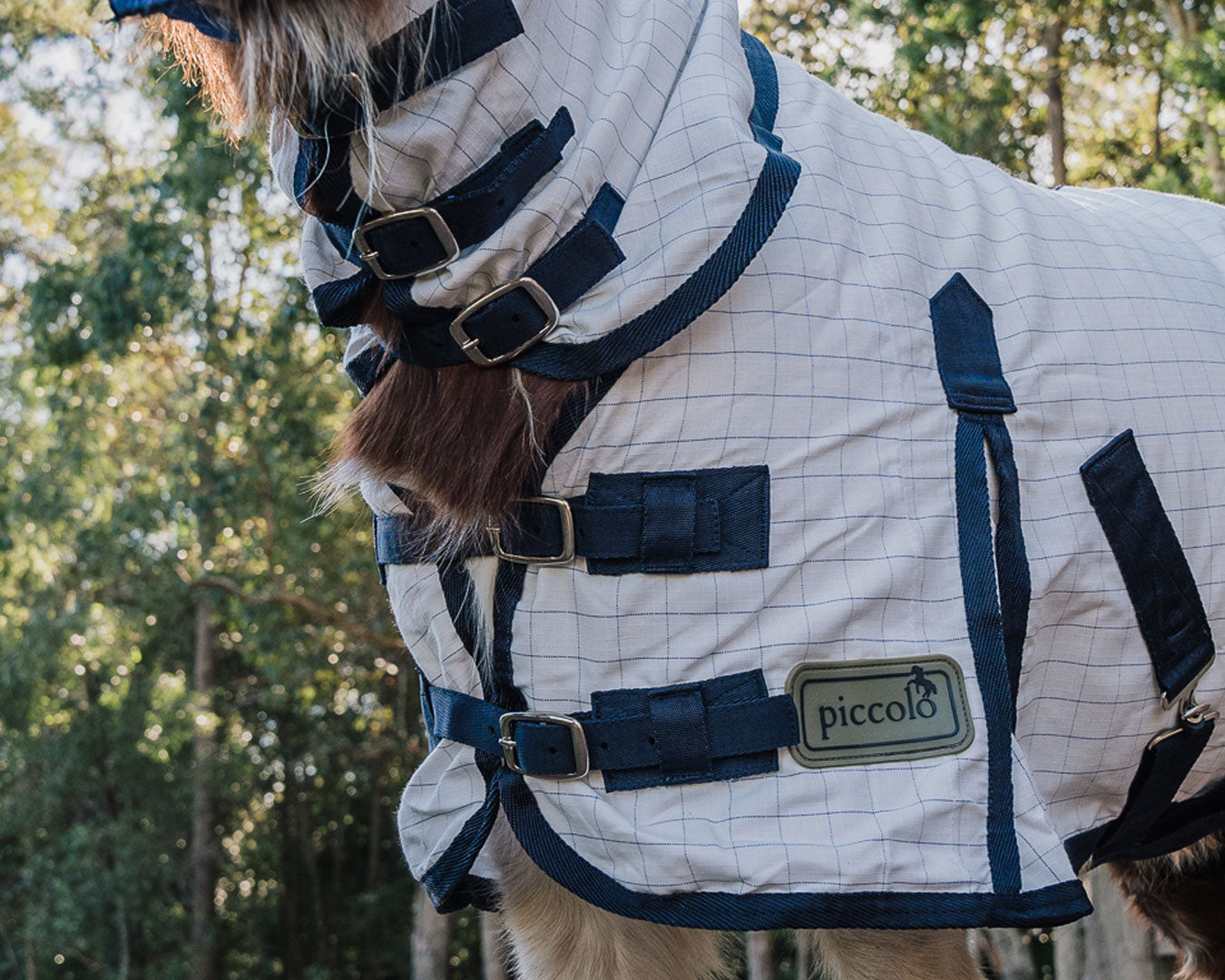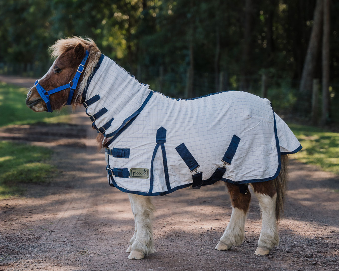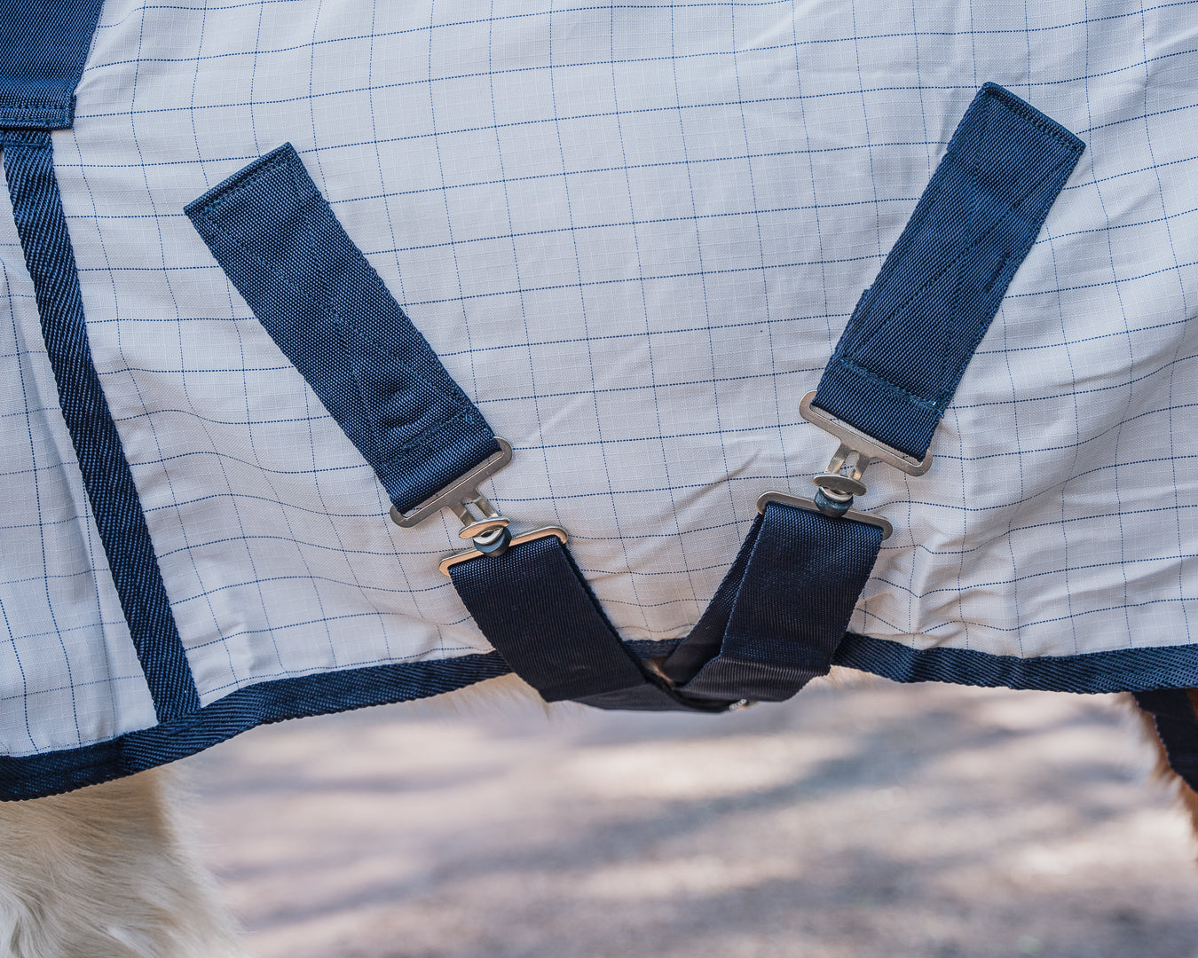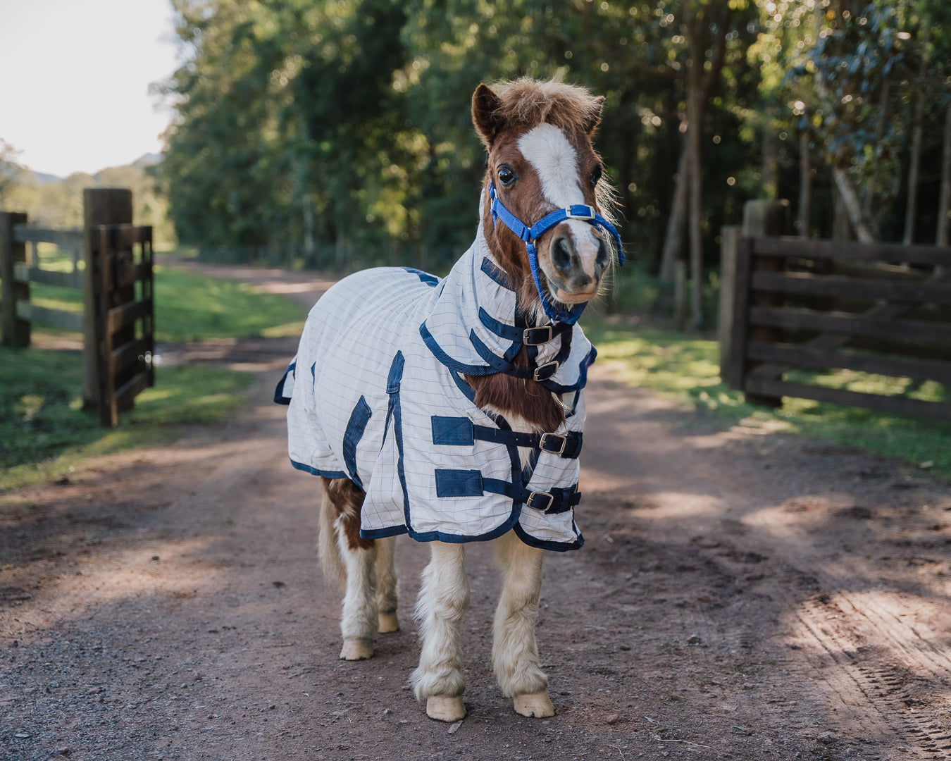 The perfect protection for the summer months. Keep your pony cool, dry and shielded from sunlight with this white polycotton rug combo with a bold blue trim. Designed with little horses in mind, this petite rug is crafted with lightweight 18oz polycotton fabric with twin buckles at the chest and removable leg straps.