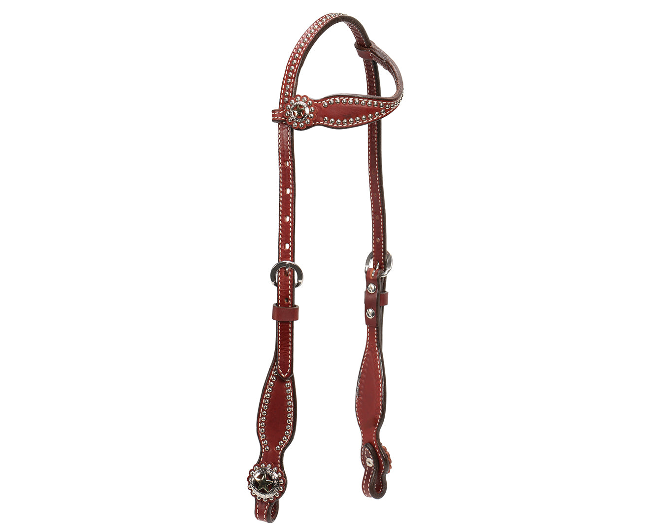 The Weaver Texas Star Collection Sliding Ear Headstall is a premium Western headstall designed for both style and durability. It is constructed from doubled and stitched 5/8" premium English bridle leather, ensuring both strength and a refined look. This headstall is part of the exclusive Texas Star Collection, known for its blend of traditional craftsmanship and unique Western embellishments.