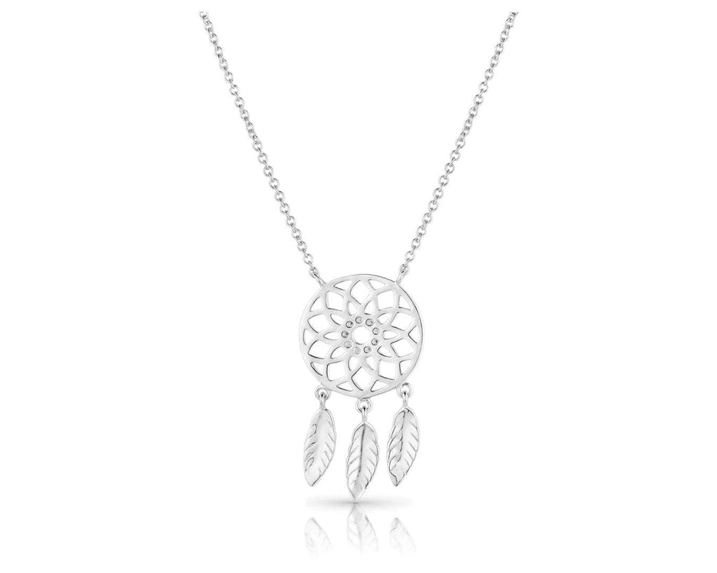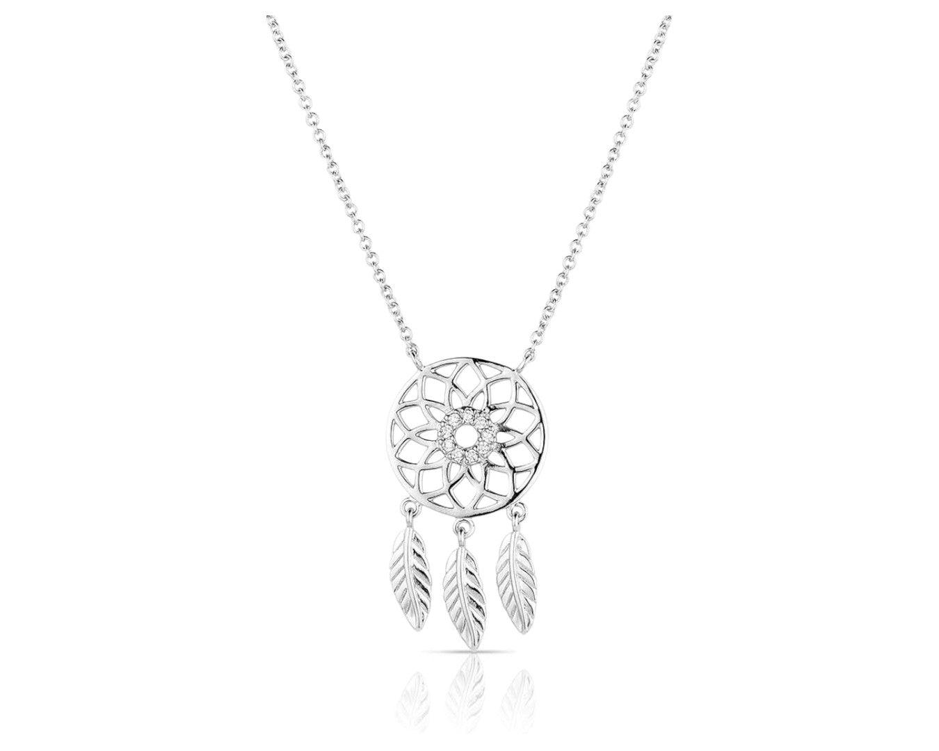 Embrace the beauty of spontaneity with the Montana Silversmiths Divine Weave Necklace, inspired by the traditional dream catcher. This stunning piece features intricate open-cut geometric patterns enclosed in a bright silver-tone circular design, symbolizing the protection against negative thoughts and bad dreams. Three elegant silver-tone feathers dangle gracefully from the pendant, adding a touch of movement and charm. The necklace hangs on a 19-inch split chain, making it a versatile accessory for any outfit. Crafted with rhodium plating over brass and accented with clear cubic zirconia, this necklace combines elegance with meaningful symbolism. Shop now to add this enchanting piece to your collection!