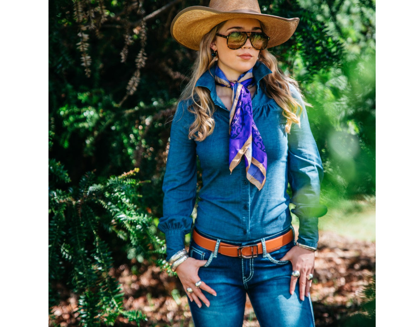 Reliably timeless, this dark denim gathered detail shirt is a wardrobe essential for every cowgirl. Tailored from lightweight stretch denim, it delivers both comfort and polish in one sleek design. Whether paired with fitted jeans for the arena or tailored pants for a smart look, this classic shirt transitions effortlessly from day to night. Featuring refined gathering at the cuff, shoulder and neckline, along with a 4.5", 3-button cuff closure and subtle H&H embroidery under the collar, this piece captures versatility and Western elegance.