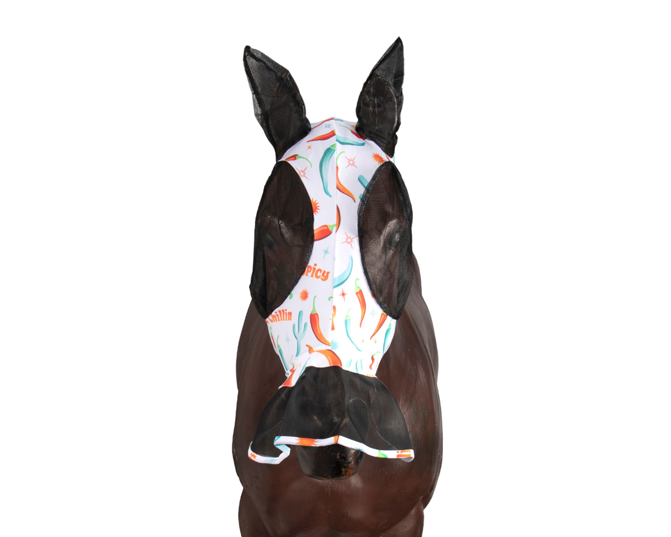 The Kool Master Lycra Pull On Fly Mask with Skirt - Hot To Trot is designed to provide complete insect protection for horses, ensuring they stay comfortable and irritation-free. Made from stretch Lycra, this mask fits snugly and is easy to pull on. It features ballistic mesh material for superior strength and includes a skirt and full ear coverage for added protection against flies and other insects. This makes it ideal for use during warmer months when flies are most bothersome. The mask completely seals out insects, combining comfort and durability in one product.