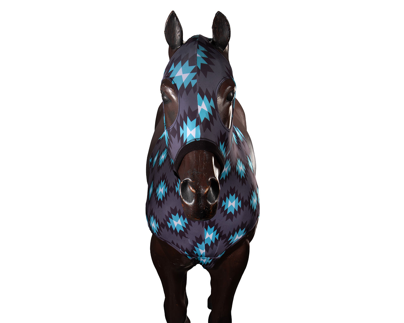 Keep your horse clean and competition ready with this Lycra Aztec Turquoise Slinky Hood. Made from soft, high stretch fabric, this hood offers a snug yet comfortable and stylish look whether the use be for stable, paddock or prior to competition. Featuring secure closures, this hood will stay in place to preserve braiding and enhance shine.