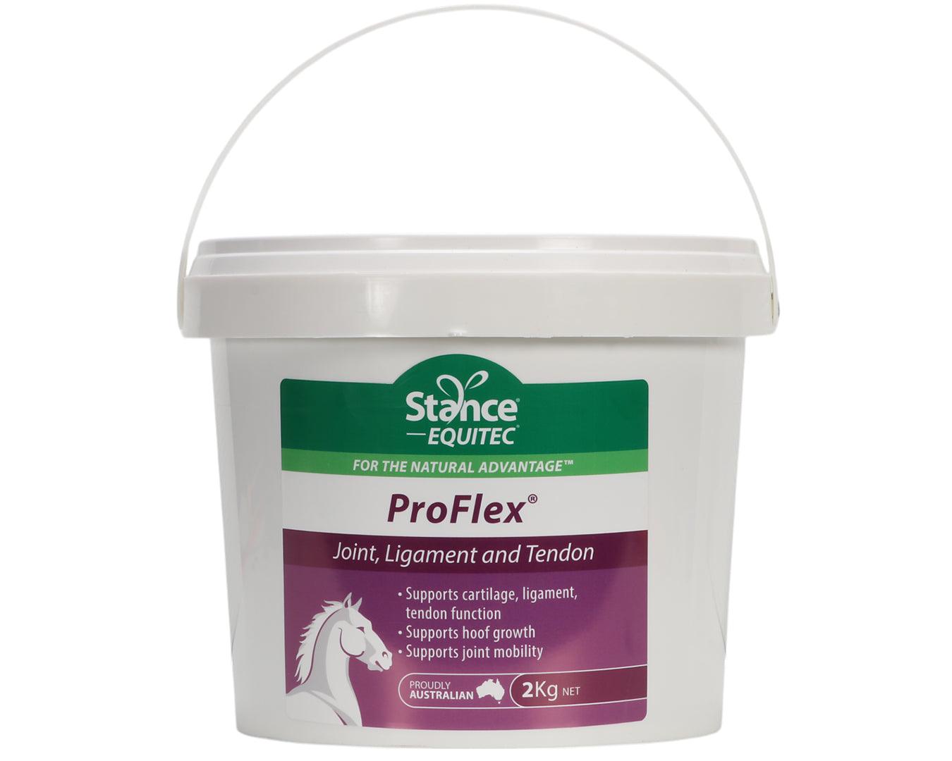 ProFlex is a comprehensive equine supplement designed to support joint health and overall well-being in horses. This natural, non-medicated formula provides essential nutrients to maintain joint mobility, ligament function, and cartilage health. ProFlex's unique blend includes glucosamine, MSM, lysine, gelatine, spirulina, vitamin C, zinc, hesperidin, and gotu kola. These ingredients work synergistically to support collagen production, cartilage synthesis, and antioxidant function. The supplement is particularly beneficial for performance horses, older horses, and those recovering from injuries.