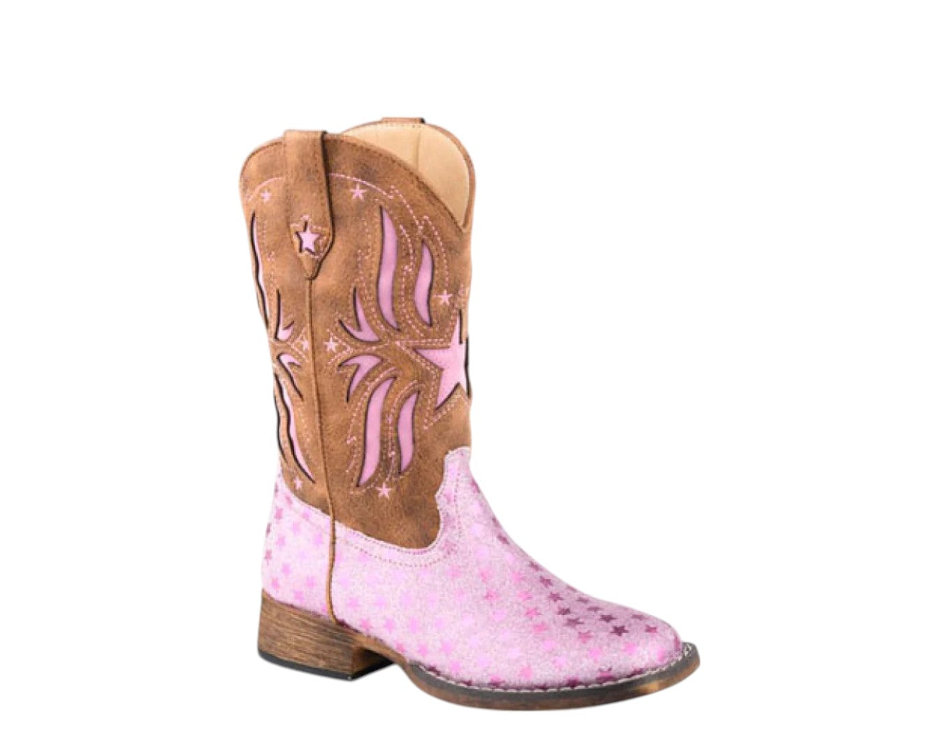 Discover the perfect blend of style and comfort with the Roper Starlet Pink Toddler Boots. Featuring a dazzling pink glitter star vamp and a brown shaft with glitter underlay, these boots showcase classic western stitching that adds timeless charm. Designed with a flexible sole and cushioned insole, they ensure all-day comfort for little feet. The inside zipper makes them easy to put on and take off, while the overlay mule ear pulls add a touch of authentic western flair.