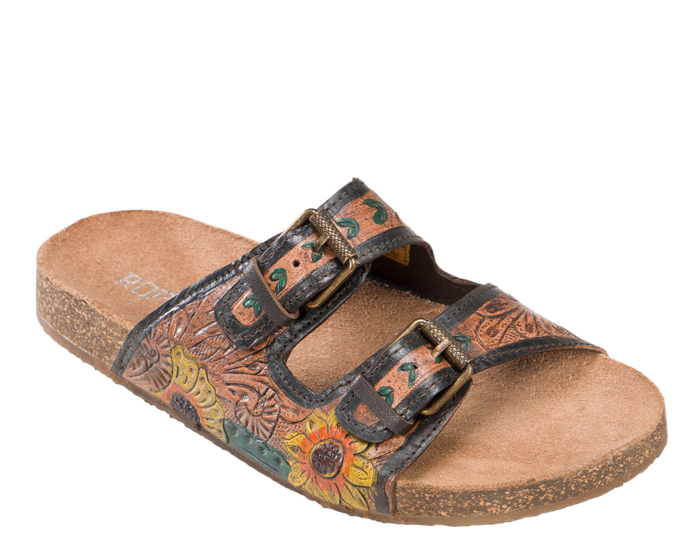 Step out in style with the Roper Women's Desiree Tan Tooled Buckle Sandals, featuring a stunning floral tooled design with two adjustable buckles for a tailored fit. Perfect for warm weather adventures, these sandals combine fashion with unmatched comfort. The moulded cork footbed midsole supports every step, while the soft comfort sock liner keeps feet cushioned all day. A gum-coloured TPR outsole ensures durability and grip for versatile wear. Discover the perfect blend of western charm and everyday practicality.