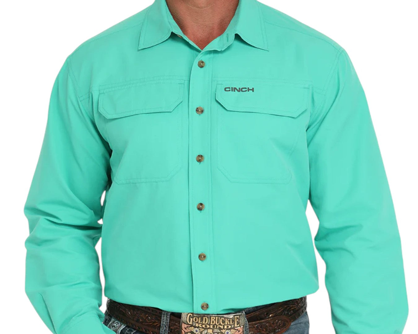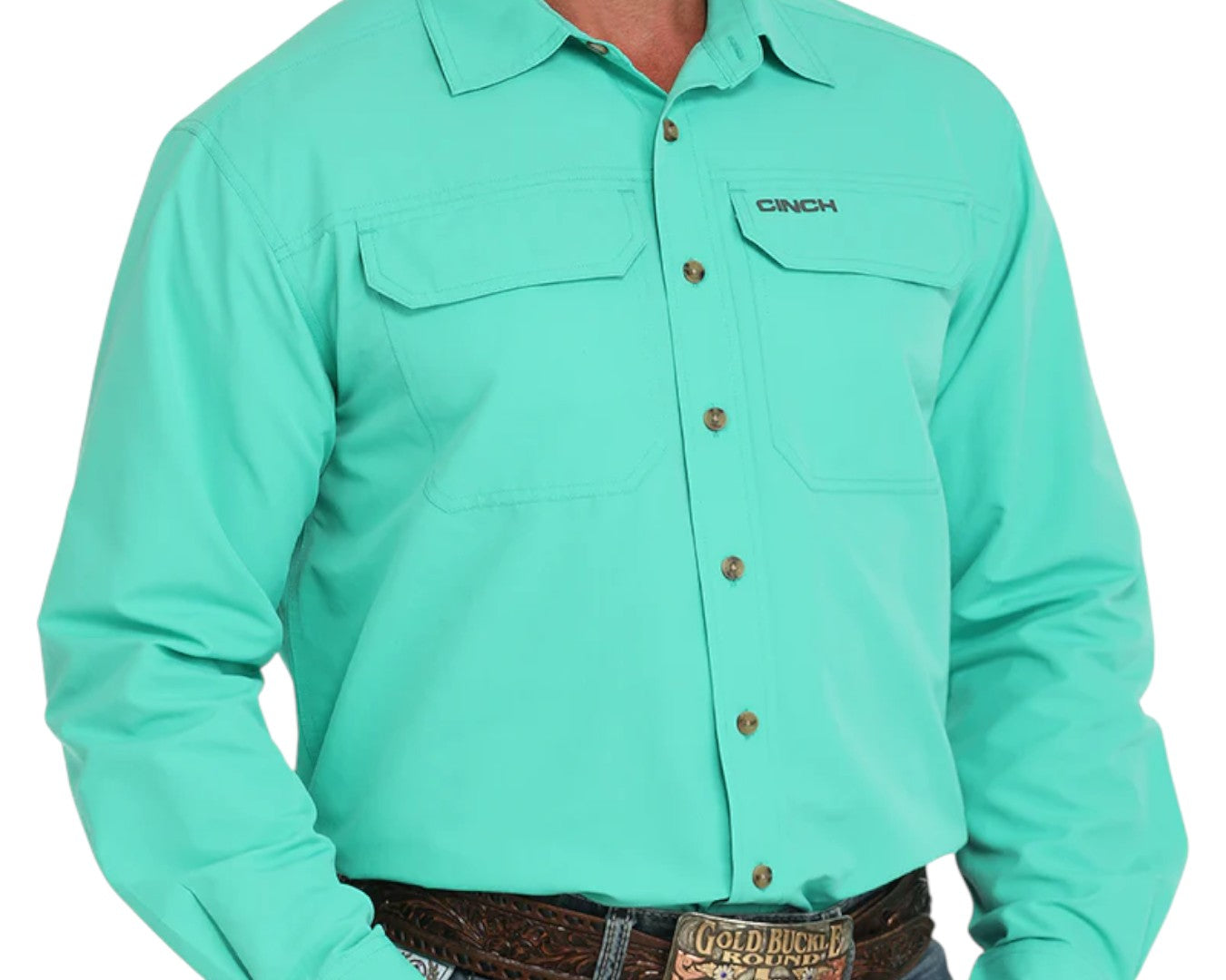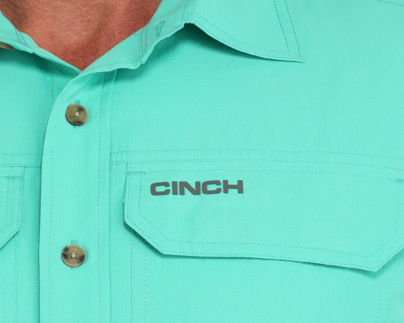 Built with adventuring in mind, the Cinch Men's ARENAFLEX Western Shirt delivers a perfect blend of comfort, durability, and style. This lightweight turquoise shirt is crafted from premium poly-spandex ripstop fabric, providing breathability and stretch for all-day comfort. Designed for active men who love the outdoors, it features a back yoke vent for added airflow, double front pockets for convenience, a sleek logo heat transfer, and eye-catching tortoise buttons for a polished Western finish. Whether you're on horseback, working the land, or exploring new trails, this shirt offers the ultimate in performance and style.