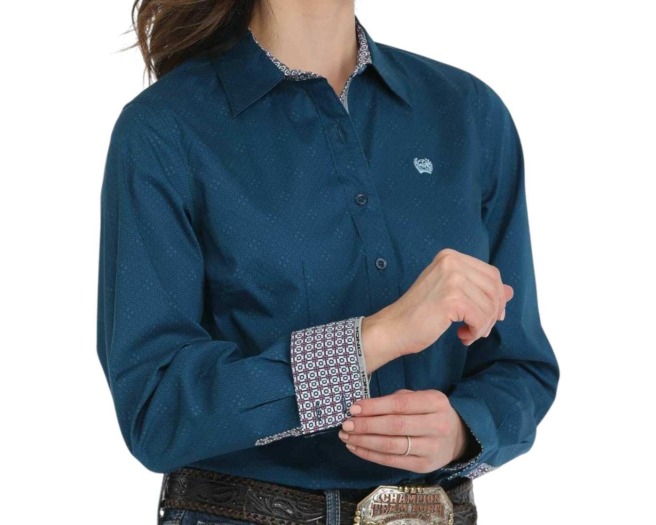 Elevate your casual wardrobe with the Cinch Women’s Blue Geometric Print Button Down Shirt, where style meets comfort. Designed with a crisp spread collar and a classic button-down front, this shirt brings effortless charm to any outfit. The contrast trim and blue buttons add a modern twist, while the single patch pocket offers practical appeal. Crafted from a breathable cotton/spandex blend, it ensures flexibility and all-day comfort. Perfect for both work and weekends, this long sleeve shirt blends western flair with everyday sophistication.