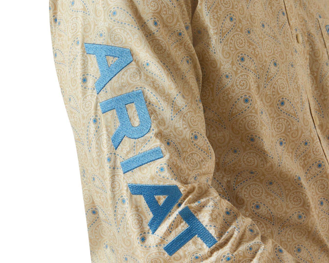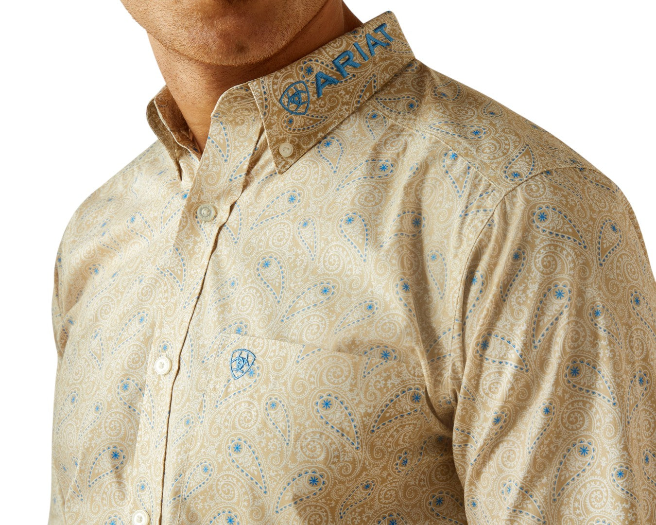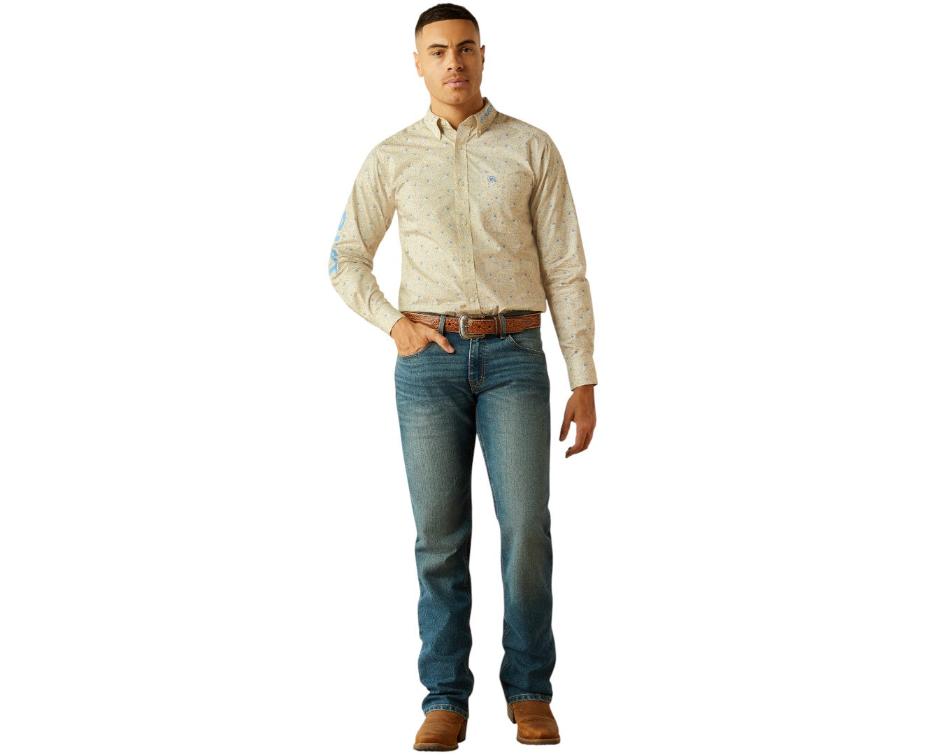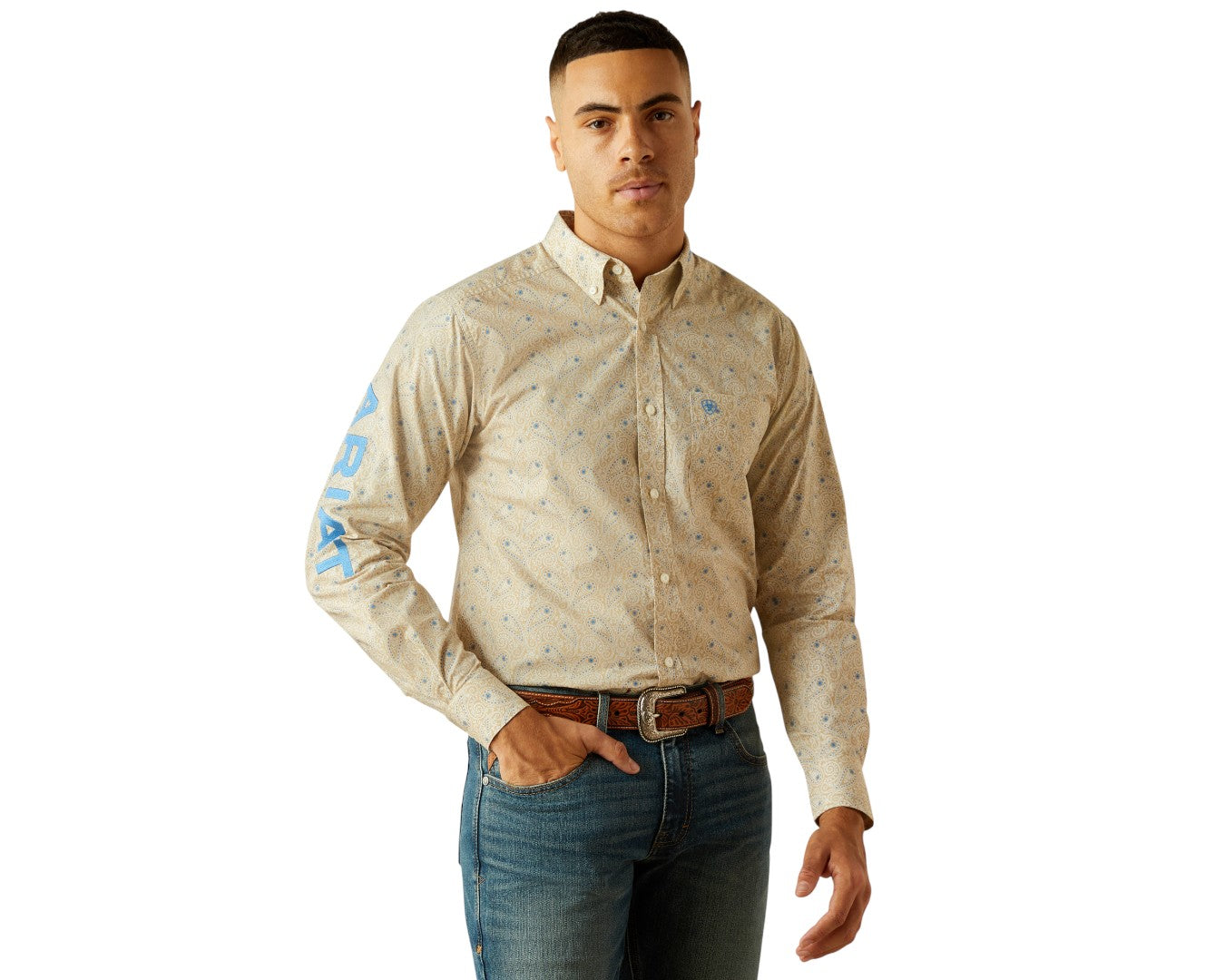 Stand out in the Ariat Men's Team Alder Fitted Shirt in classic khaki and blue. Designed for all-day comfort and style, this long-sleeve shirt offers a tailored fit with 100% cotton softness. The bold Ariat team embroidery adds a signature touch, while the spread collar and buttoned cuff details deliver polished versatility. A hidden pen slot in the left pocket blends function with practicality, perfect for work or weekend wear. Crafted with quality and built to last, this shirt keeps you looking sharp and feeling confident.Ā