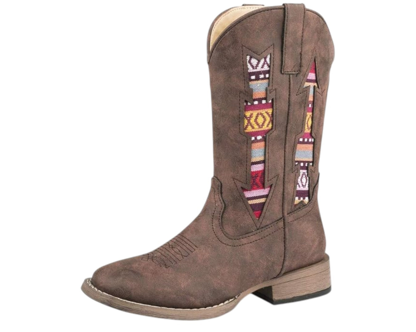 Discover the ultimate western-style boot for young adventurers with the Roper Kids Double Arrows Boot. Crafted with adorable Aztec-inspired design and comfortable features, these boots are perfect for little cowboys and cowgirls. Made from quality faux leather with intricate double arrow panels, these boots combine style and practicality for children's footwear. Ideal for dress-up, play, or casual wear, these boots will make your child stand out with western charm.
