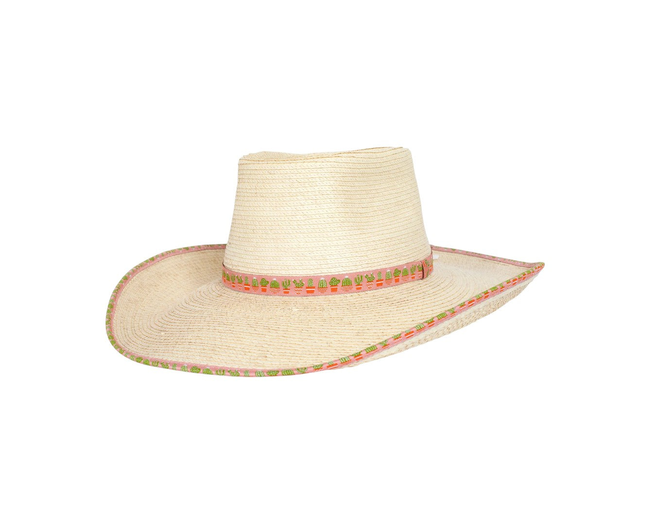 Discover the Sunbody Ava Hat in Pink Cactus, crafted from natural Guatemalan standard palm leaf with a semi-telescoped crown and bound edge for durability. This stylish hat features a matching patterned hat band for a unique touch and is approved for reshaping to suit your style. With a practical 4 ½” brim and 4 ¼” crown, it offers excellent sun protection while maintaining comfort. Perfect for outdoor adventures or casual wear.