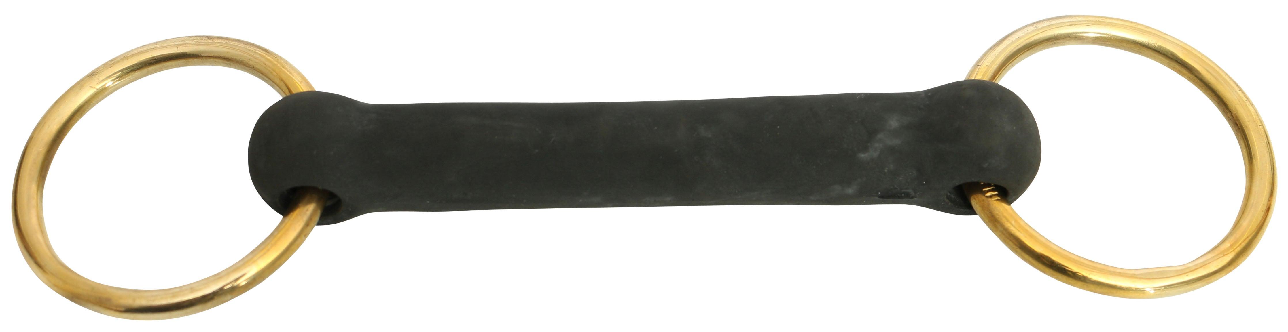 - Loose ring snaffle featuring brass rings and flexible rubber mullen mouth.