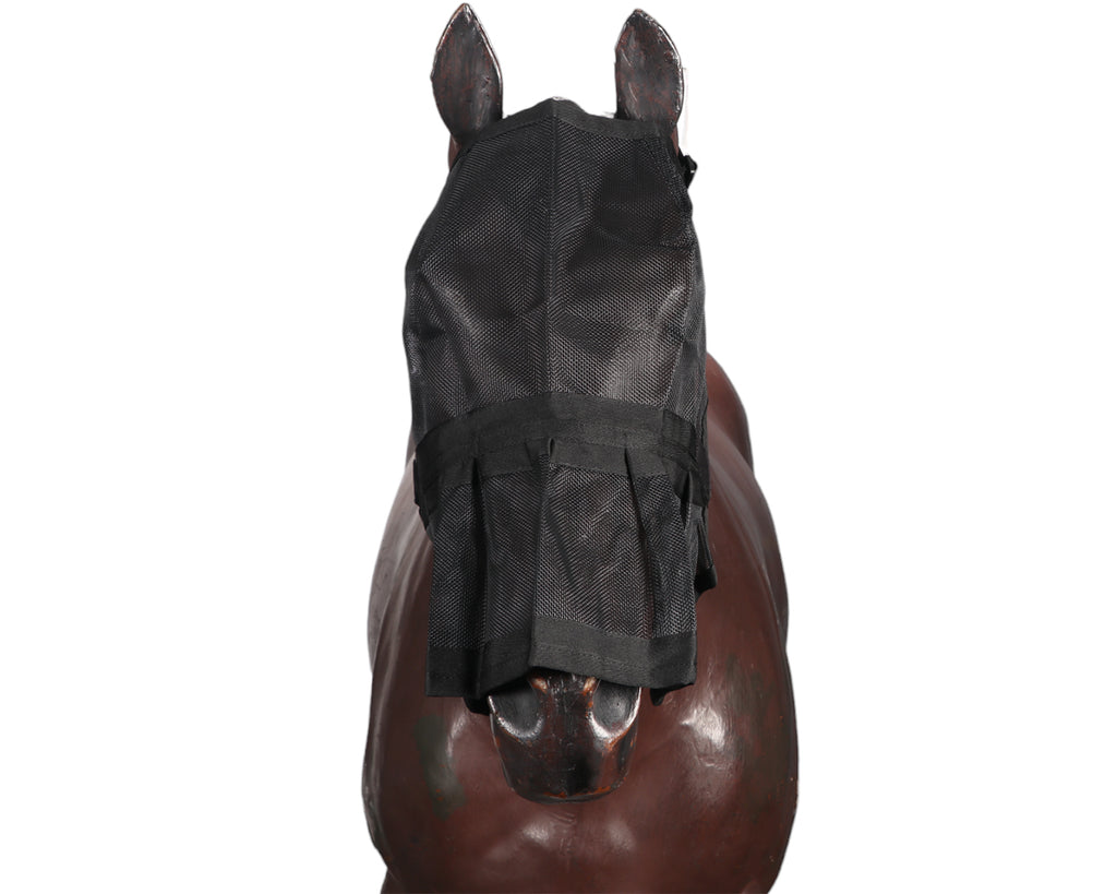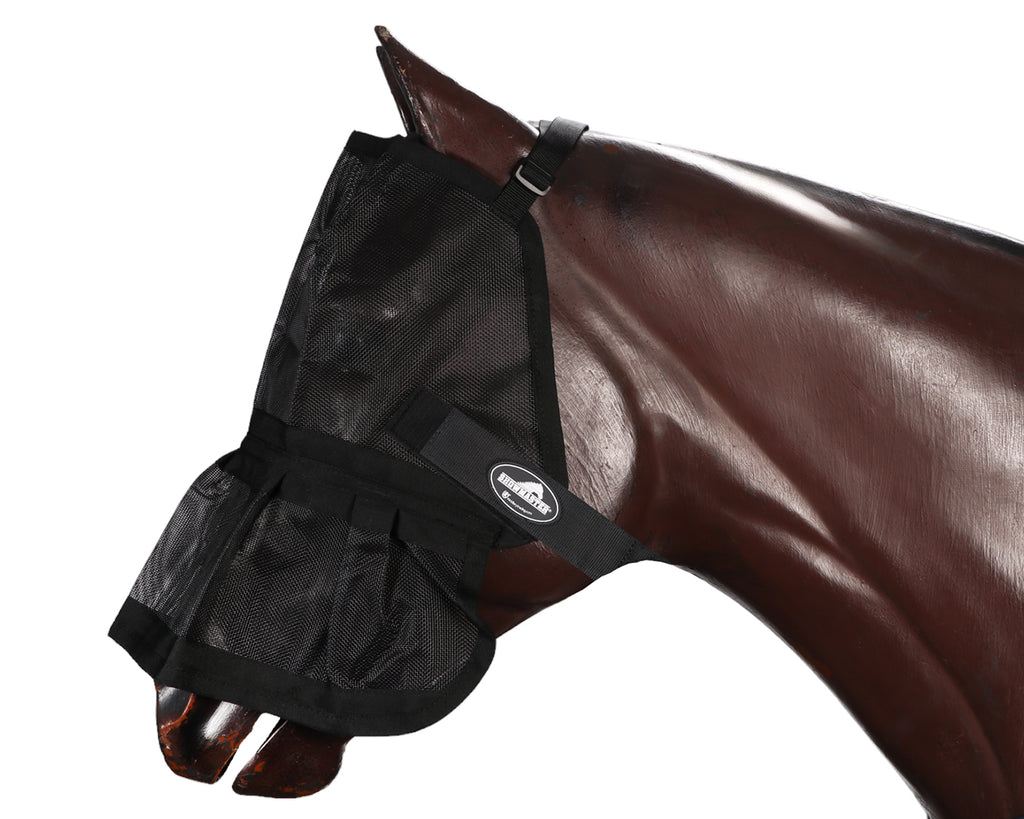 The Horsemaster Fly Mask with Wide Skirt is crafted from strong black mesh, providing both durability and comfort for your horse. This fly mask features a generously sized nose skirt that effectively shields your horse from annoying insects and the harsh sun. Designed with practicality in mind, the adjustable velcro strap ensures that the fly mask fits securely along with an additional adjustable strap around the poll to help keep the mask in place. This fly mask is a must-have for protecting your horse from pesky flies and other irritants.
