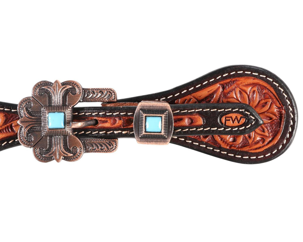 Calling all turquoise lovers! The Wildflower Spur Straps are beautifully hand-tooled with a floral design, accented by copper dots and turquoise flower embellishments. Featuring matching buckles for adjustment, these spur straps are the perfect complement to the Wildflower collection, with the matching headstall and breastcollar available to complete your set.