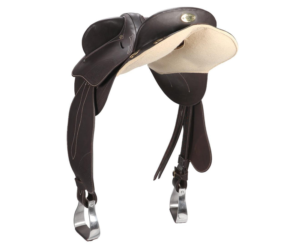 A key feature of this saddle is its interchangeable gullet system, which allows riders to tailor the saddle’s fit to suit different horses. Additional gullet plates are available to customize the fit further. The saddle also includes solid alloy stirrups, double tongue buckles for adjusting the fenders, and comes with a girth top strap with points on each end.
