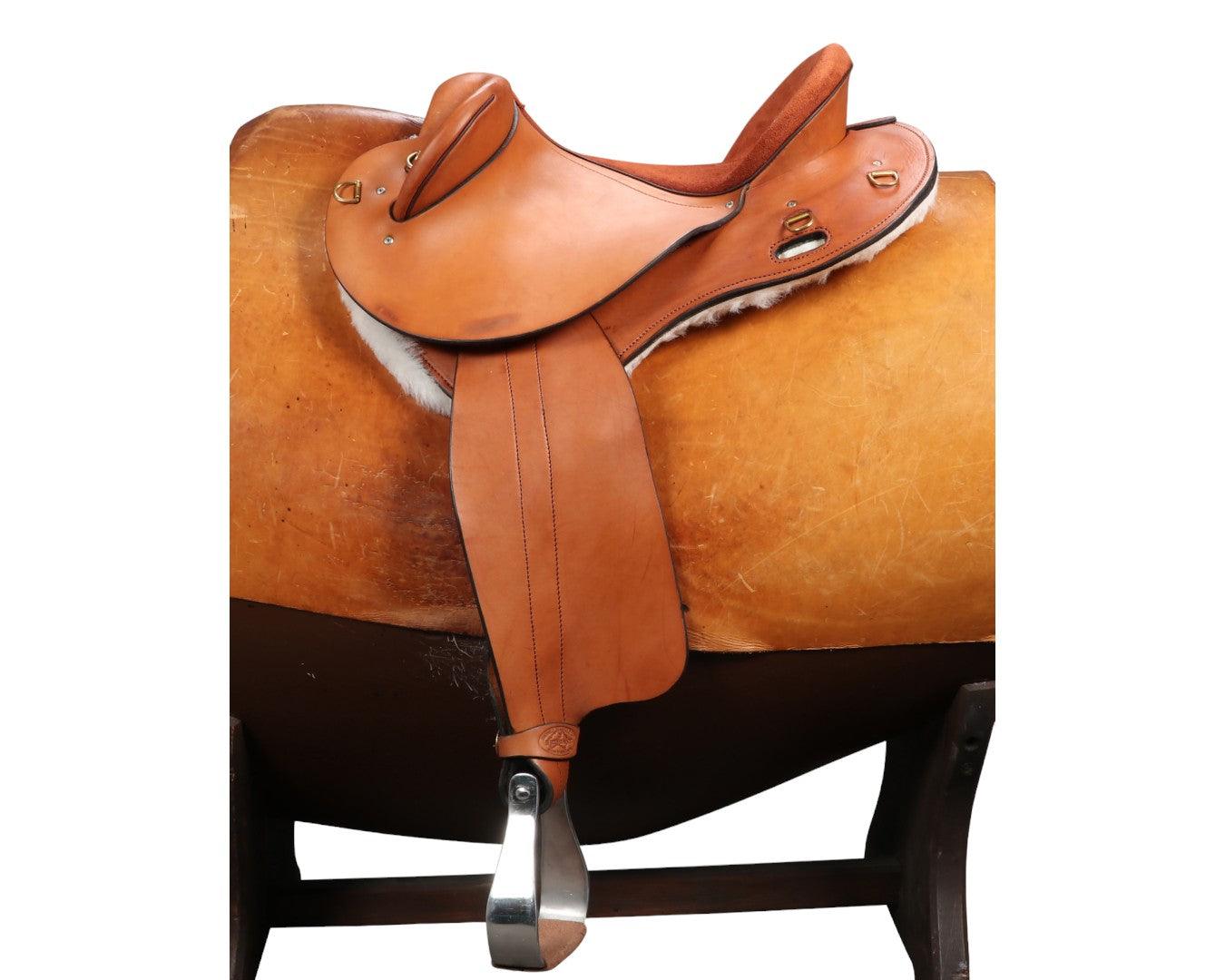 Sidney Hamilton, Australian-made swinging fender, this saddle is designed for competition, pleasure riding or work. Its roughout seat provides enhanced grip and security, while the fender’s stirrup suspension bar allows riders to position their legs forward naturally. Built for close contact and durability, it’s available with medium (6") or wide (7") gullets to accommodate different horses. Ideal for riders prioritising stability and comfort in rugged conditions.