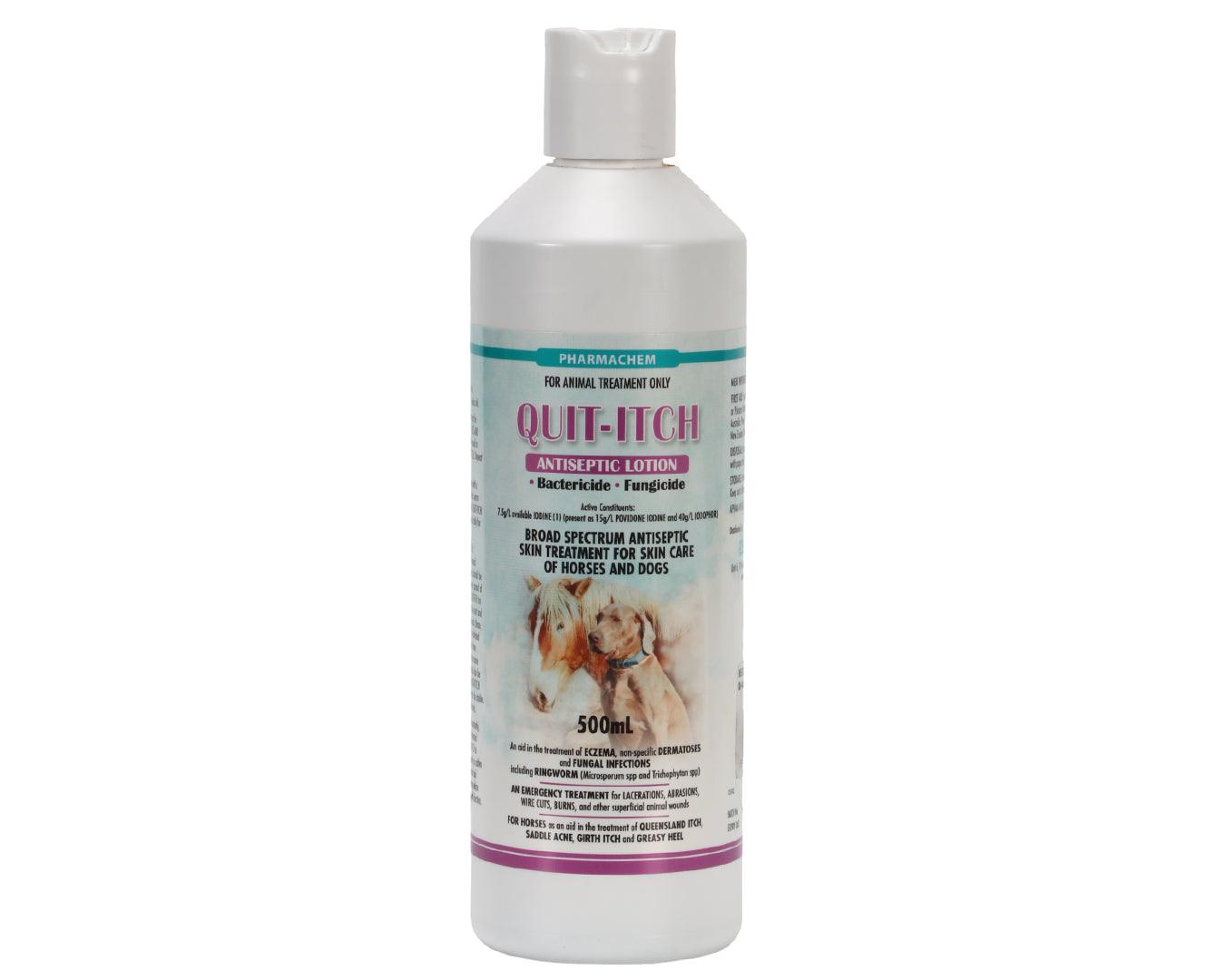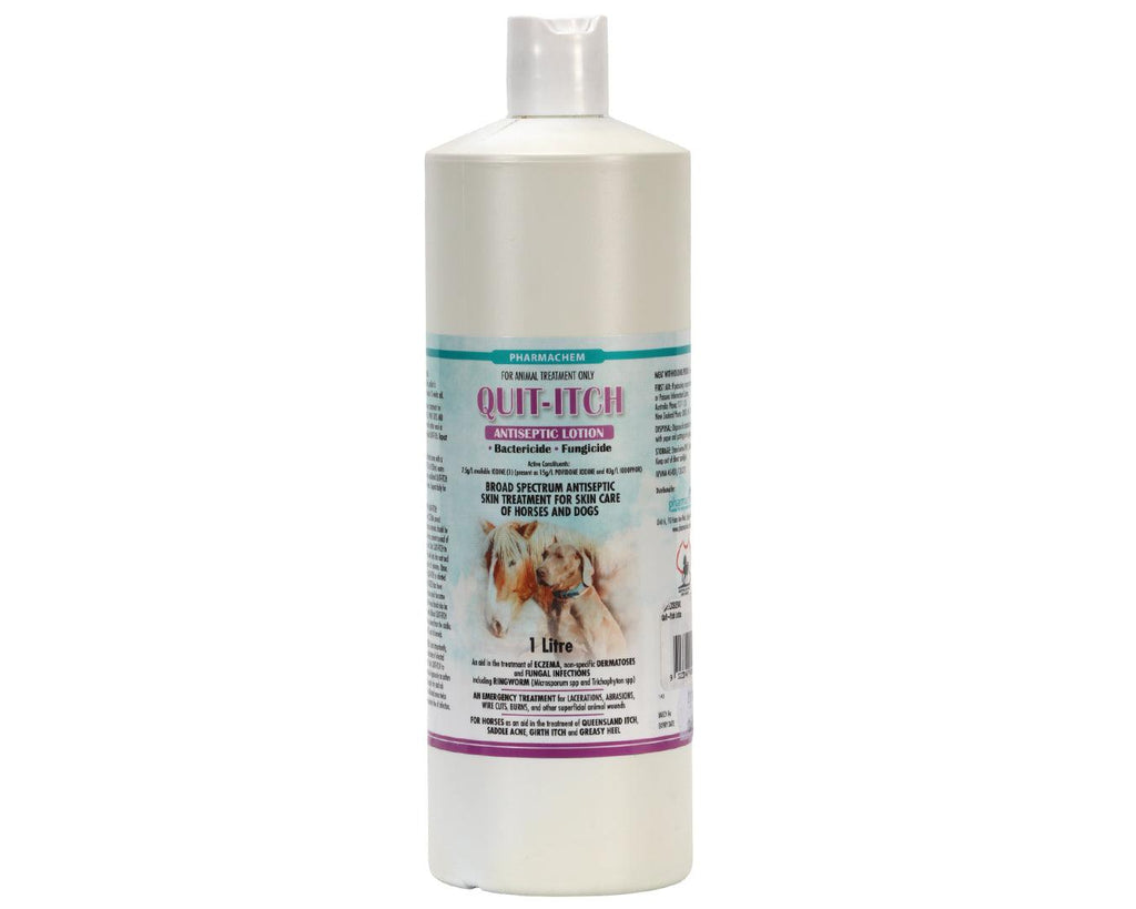 Quit-Itch Lotion is a trusted broad-spectrum antiseptic and antifungal skin treatment designed for dogs, cats, and horses. It effectively soothes and heals skin irritations including eczema, ringworm, Queensland itch, girth itch, cuts, burns, and other superficial wounds. This reliable lotion helps prevent the spread of fungal infections while promoting fast relief from itching and discomfort. Ideal for use in your pet’s first aid care, it also assists in maintaining healthy skin and coat.