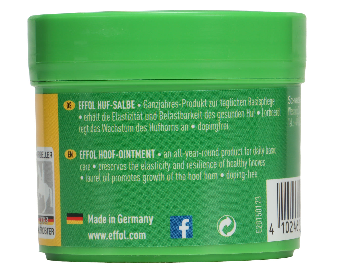 The original Effol Hoof-Ointment ensures healthy hoof growth and also has a disinfecting effect. The combination of laurel and thymol effectively helps to protect against hoof diseases. Vaseline forms a water-repellent and dirt-repellent film which protects the hoof against outside influences. Daily use guarantees an end to brittle hooves! For external use always start from the coronet when applying Effol Hoof-Ointment.