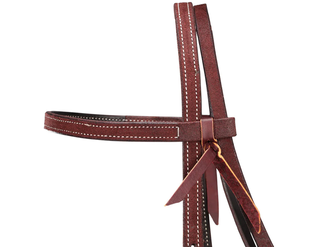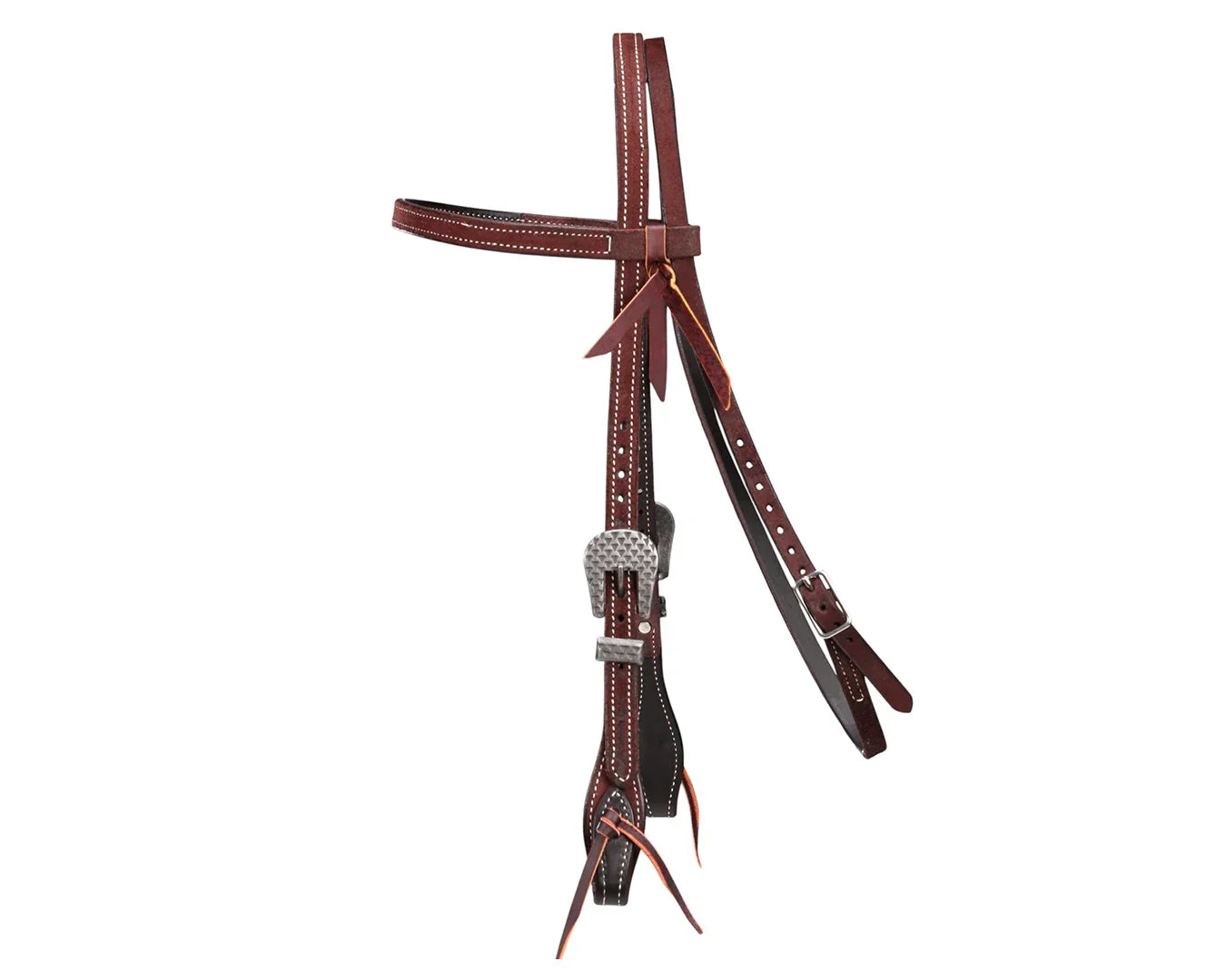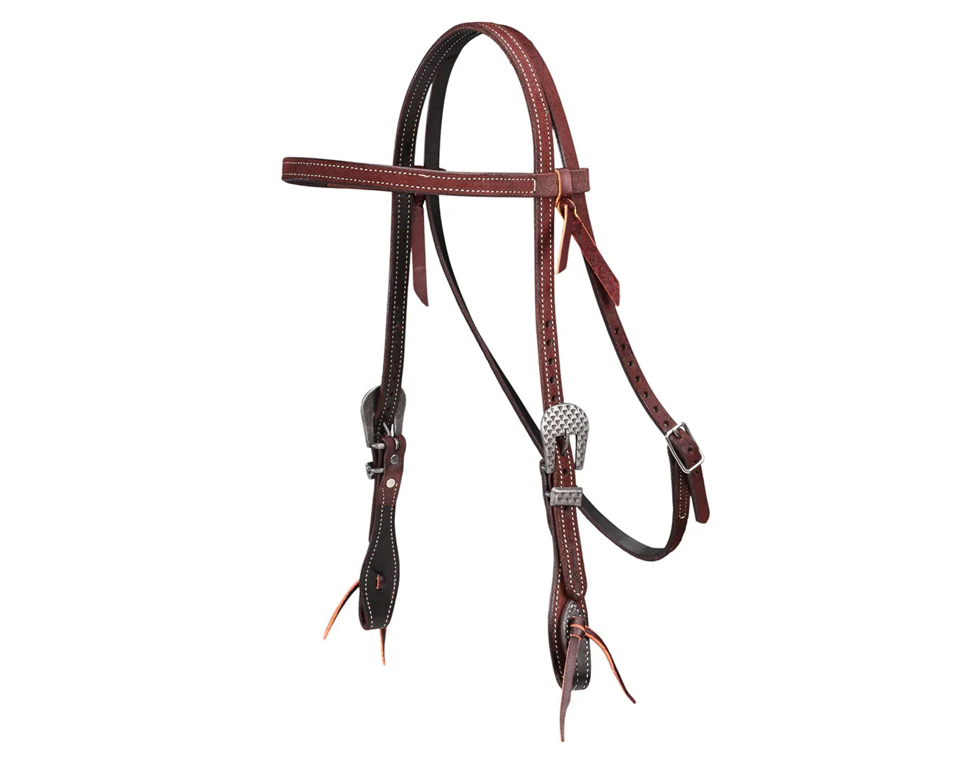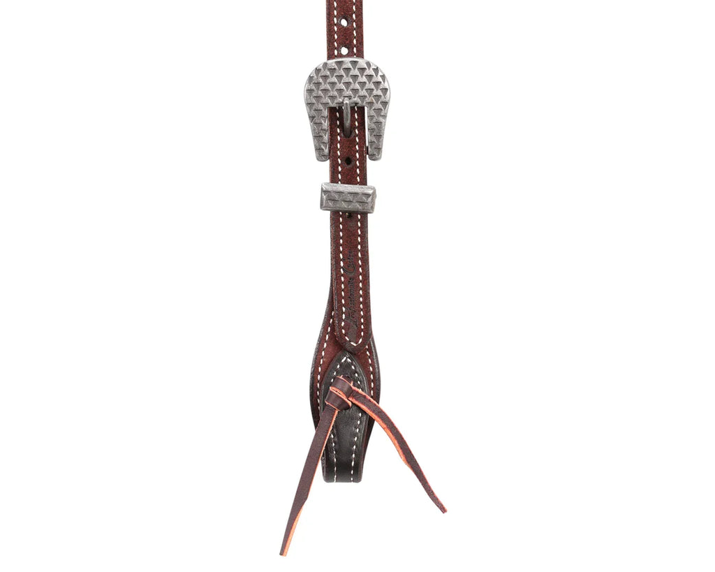 Combining traditional western design with durable construction, the Chocolate Roughout Browband Headstall is crafted for riders who value both function and style. Made in the USA from 5/8" chocolate roughout leather, this headstall features scalloped cheeks and double buckle adjustments for an ideal fit. The unique rasp motif heel-style buckles add a touch of rustic detail, while lace tie ends complete the classic look. Hand-rubbed and top-stitched with a light oil dressing, this headstall is built to last through everyday use while maintaining a refined, handcrafted finish. A reliable choice for working riders, trainers and western enthusiasts alike.