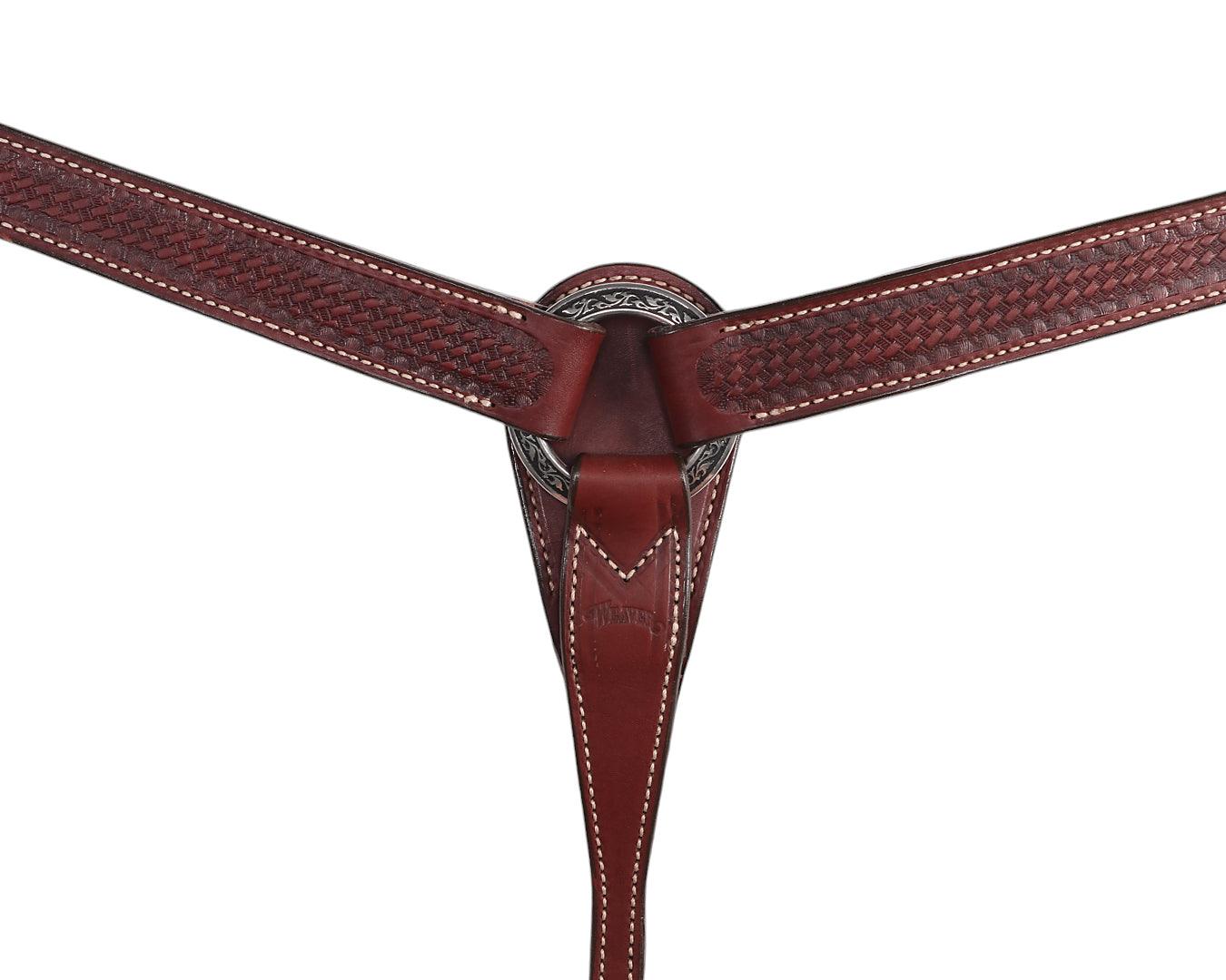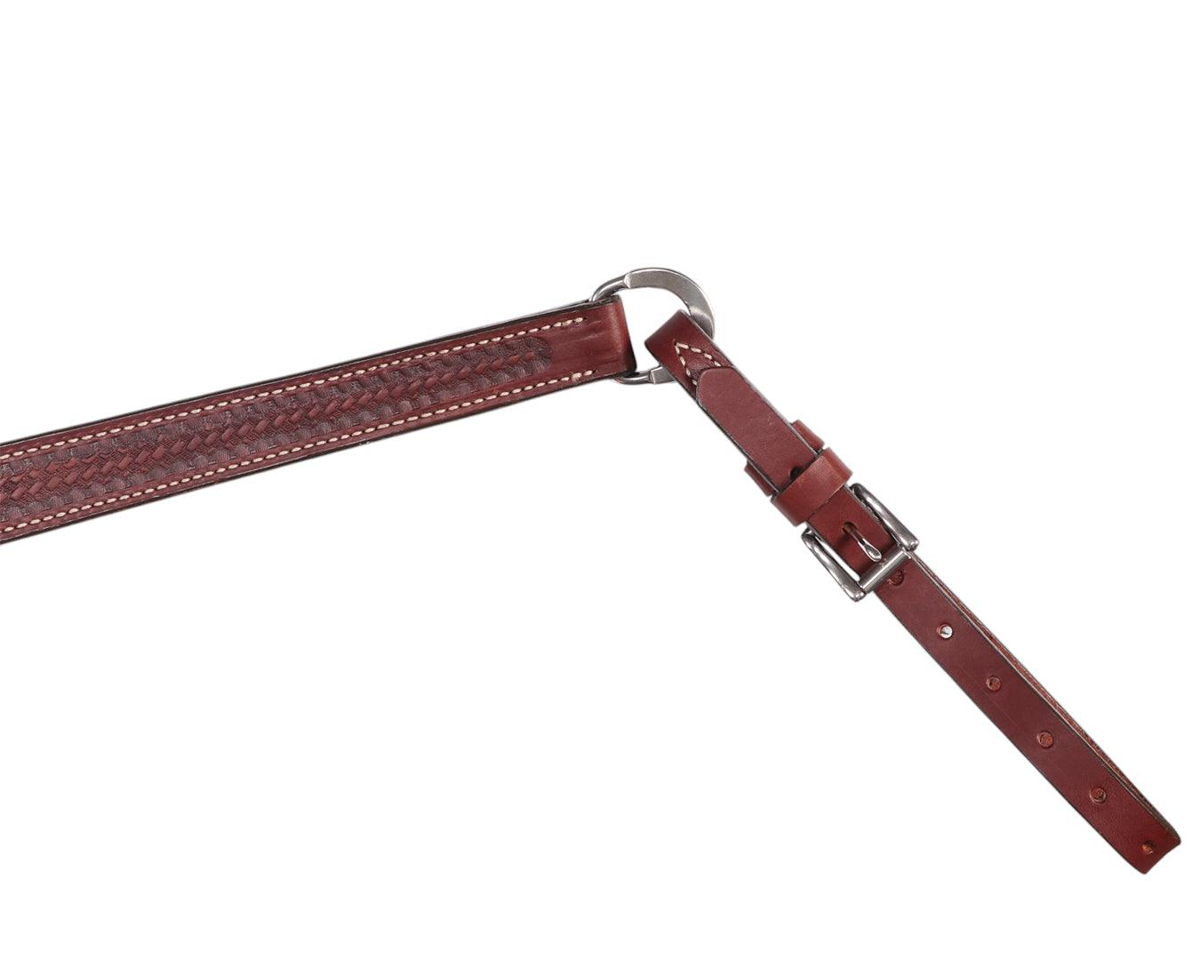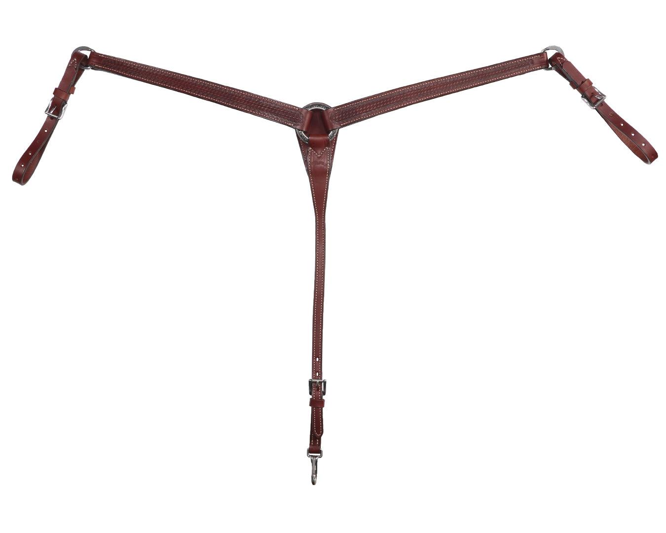 Experience the legacy of Great Basin horsemanship with the Weaver Basin Cowboy Heritage Tapered Breastcollar. Crafted from premium English bridle leather, this breastcollar pays homage to the skilled vaqueros and working cowboys of the region. The intricate stamped basketweave design and wheat-coloured stitching showcase exceptional craftsmanship, while the painted leather edges add a refined touch. Featuring a tapered width from 1-½" to 1", this breastcollar ensures optimal comfort and functionality for your horse. The durable stainless-steel hardware complements the overall quality, making it perfect for both daily use and special occasions. Elevate your riding gear with a piece of cowboy heritage! Shop now to add this exquisite breastcollar to your tack collection.
