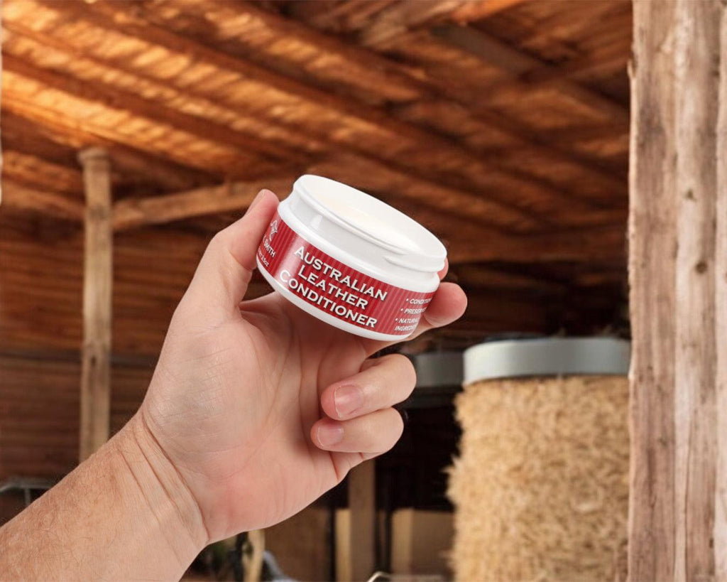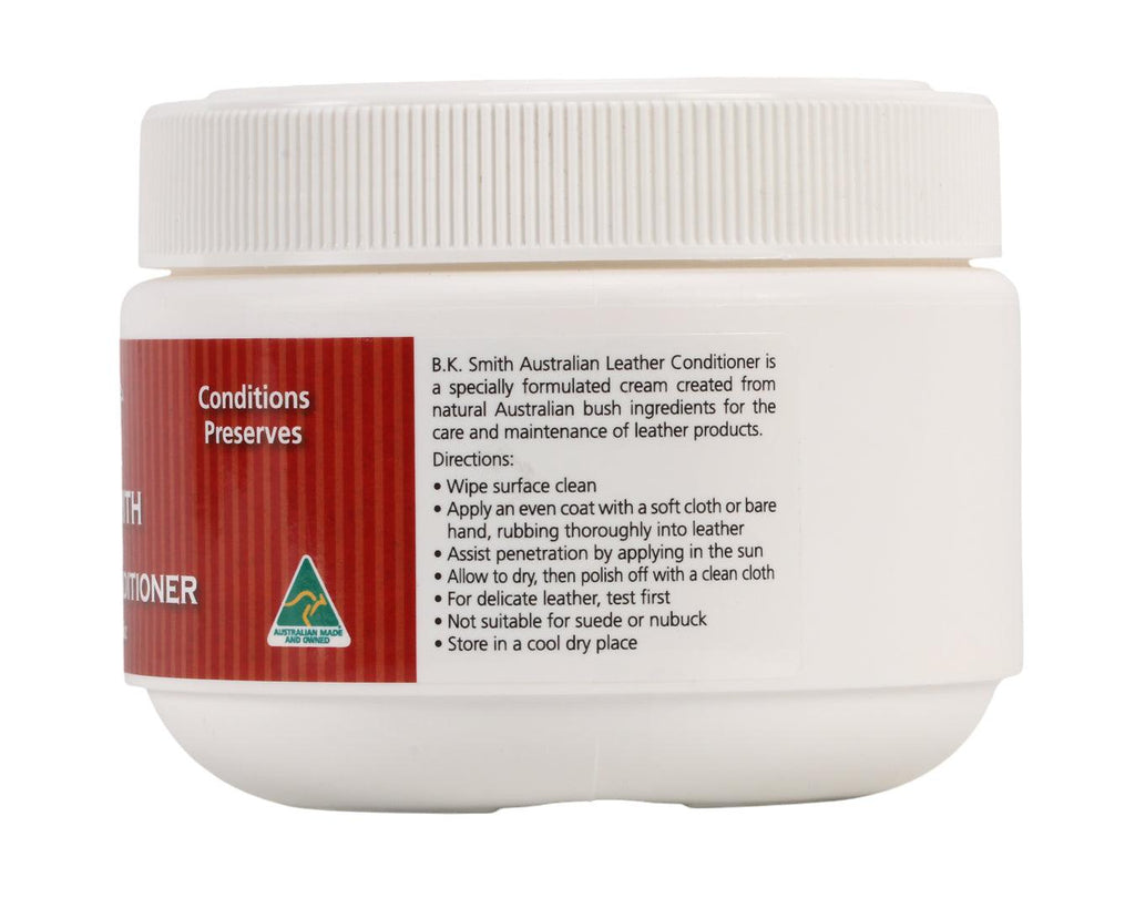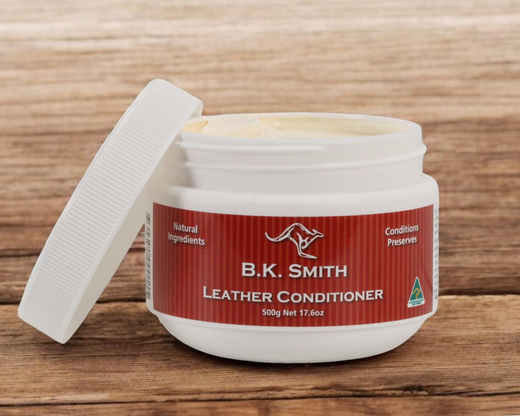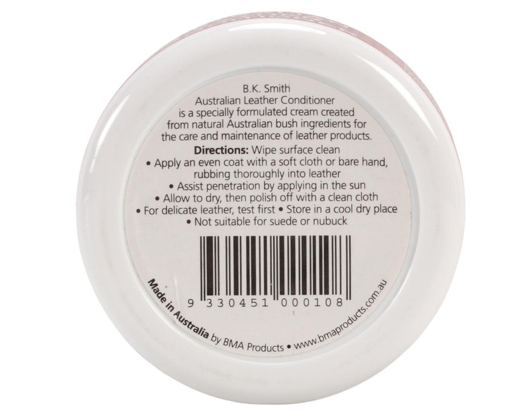 B.K.Smith Australian Leather Care is a cream created specially for Australian conditions. Created from natural bush ingredients for the care and maintenance of leather products. When applied in the sun and rubbed down with a soft cloth, will penetrate the leather and leave it clean. Helps preserving the leather and stitching and will not stain clothes.