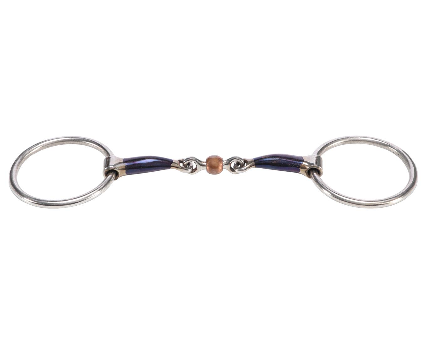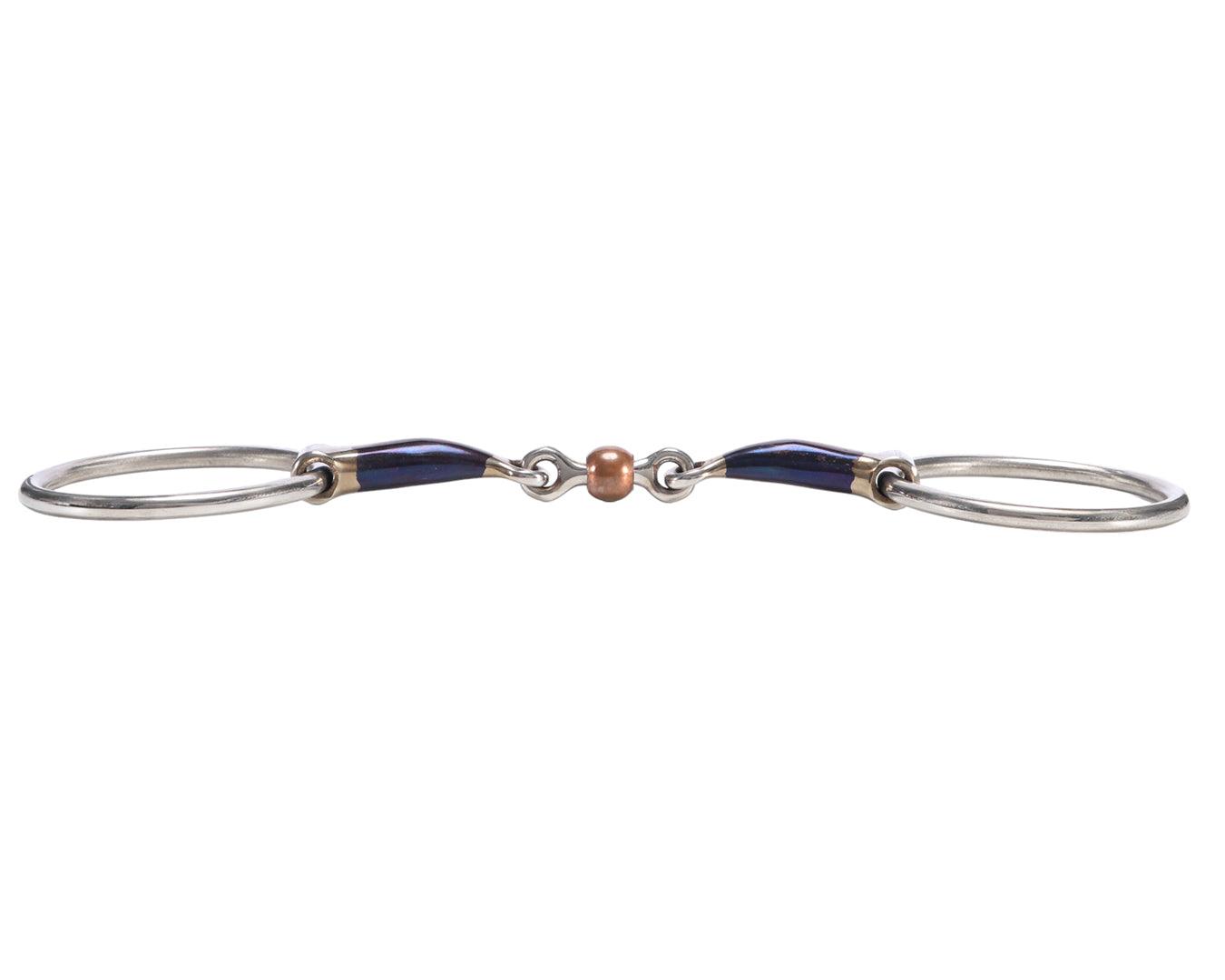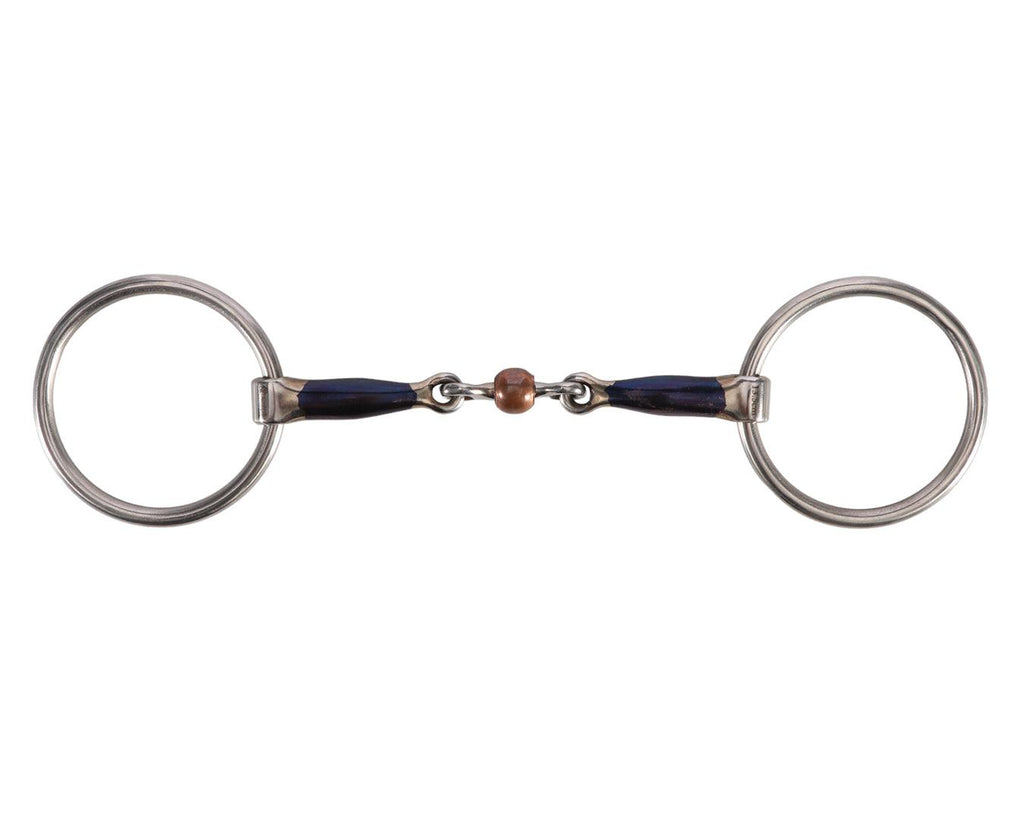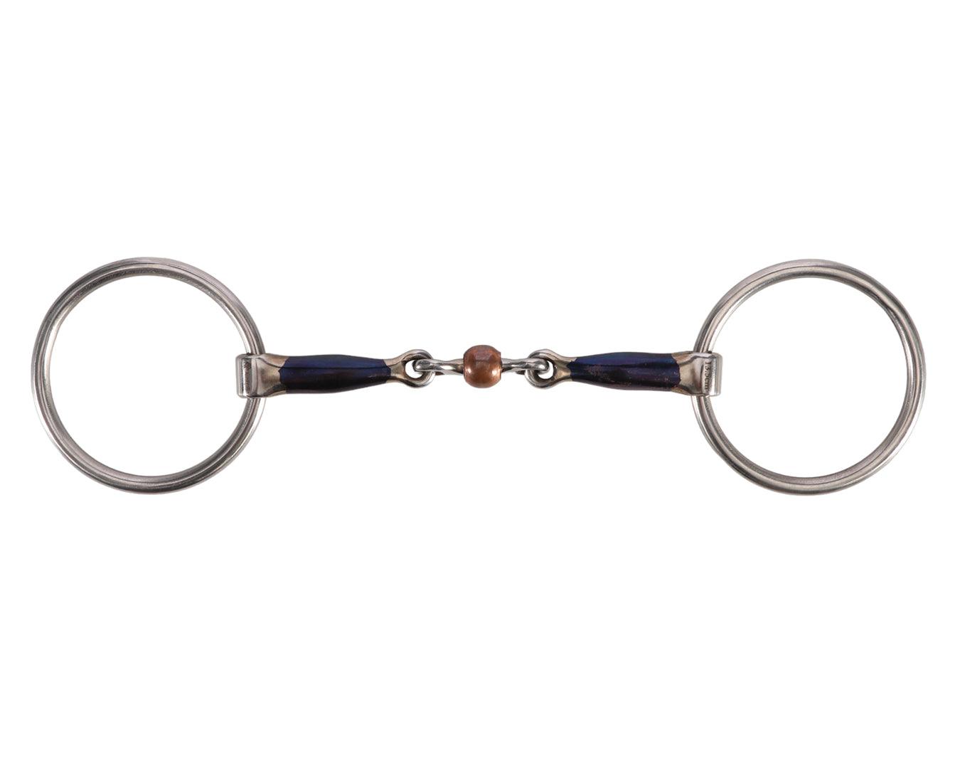 The Blue sweet iron loose ring w/copper roller encourages a forward contact-seeking horse and alleviates tongue issues. The Loose Ring allows for immediate release and relief from tongue and bar pressure. The bit is immediately reset to a neutral position in the horse's mouth.