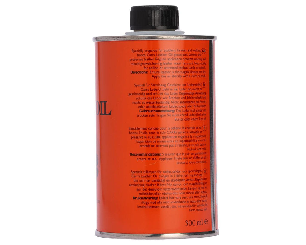 Discover Carrs® Leather Oil, a premium leather care product from Carr & Day & Martin. This heavy-duty oil is specially formulated to revitalize excessively dry, cracked, and brittle leather items. Available in a convenient 300ml size, it offers an effective alternative to traditional Neatsfoot oil. Carrs® Leather Oil deeply penetrates leather fibers, softening and suppling even the most neglected leather equipment. Ideal for restoring old tack or maintaining heavily used leather goods, this oil ensures your leather stays pliable and protected.