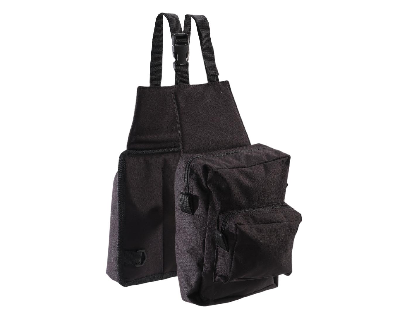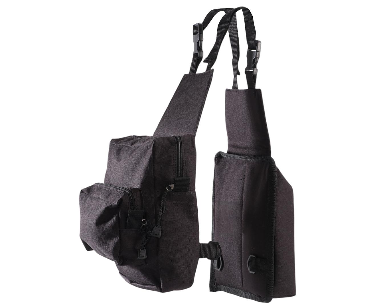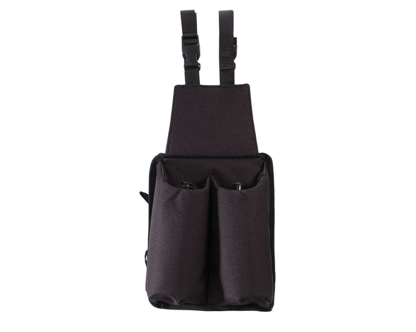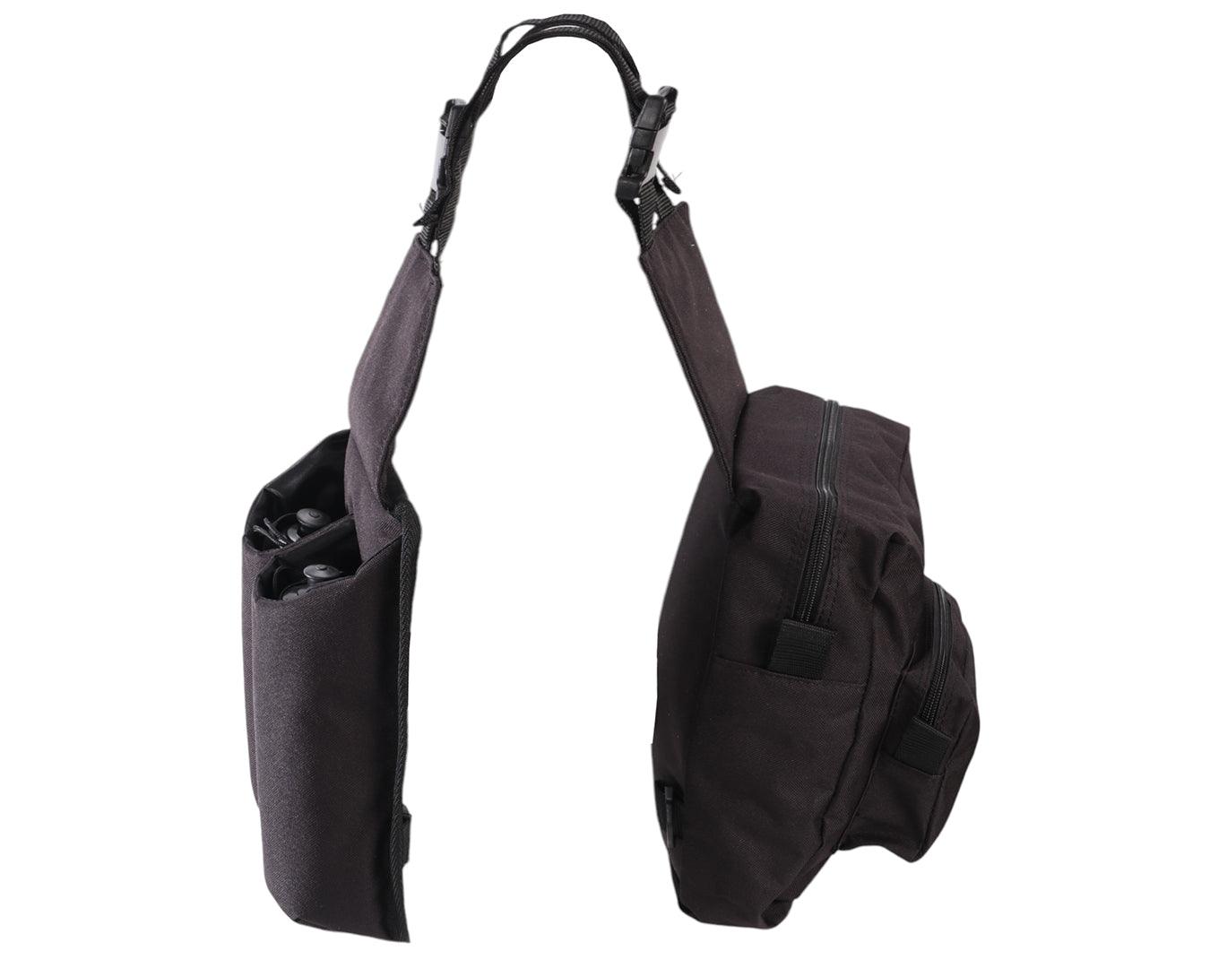 - Black Cordura nylon with 2 water bottles on one side and 2 zippered pouches on other side.