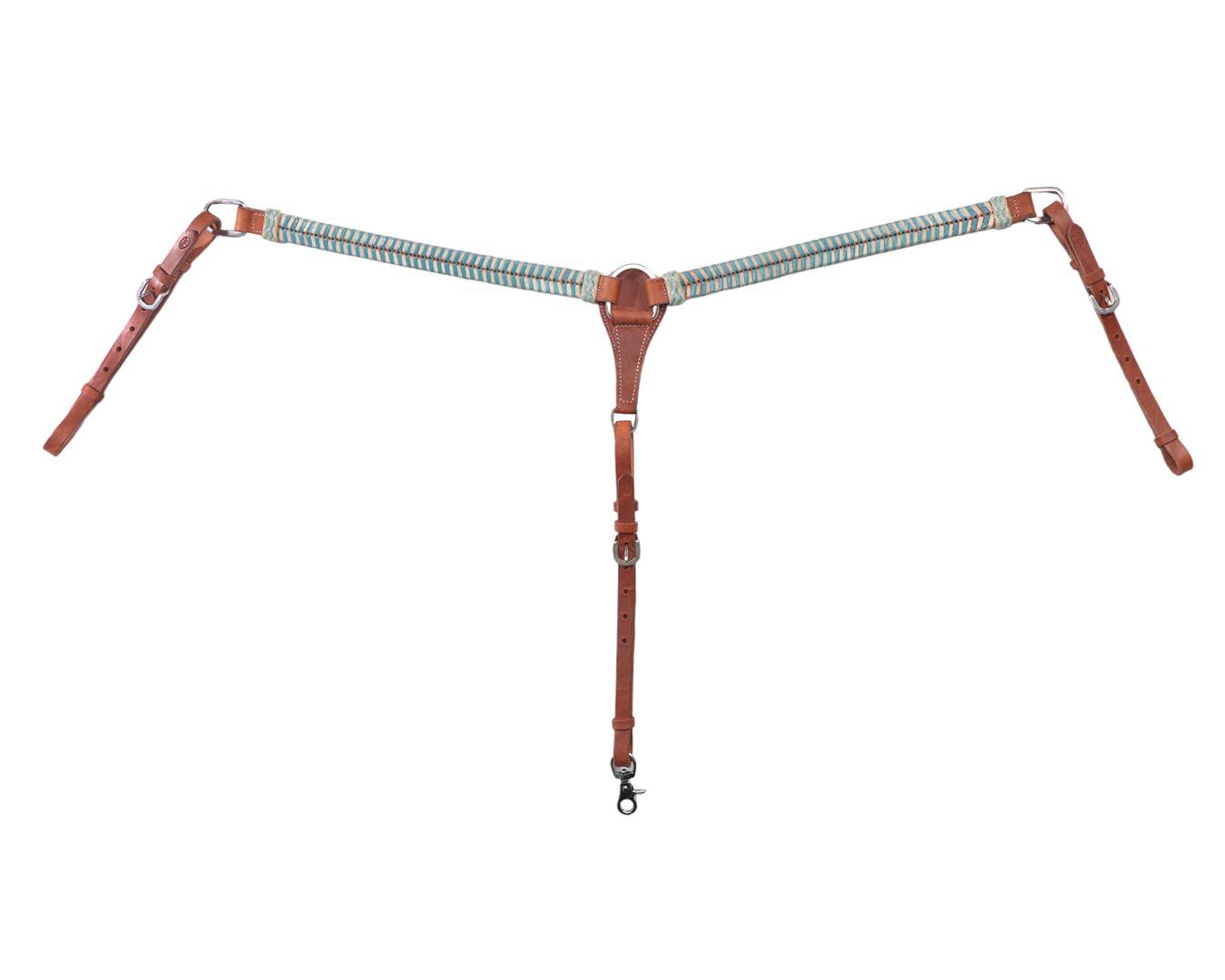 Introducing ‘Aponi’ this gorgeous breastcollar is part of a matching set complete with a headstall, spur straps, and tie down noseband. The natural-colored premium leather, complemented by vibrant turquoise and natural rawhide accents, creates a striking contrast.