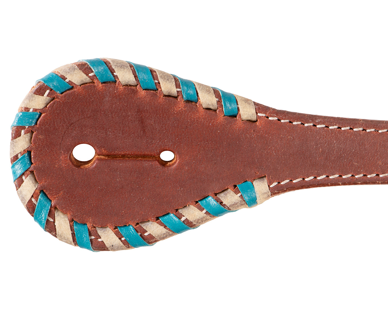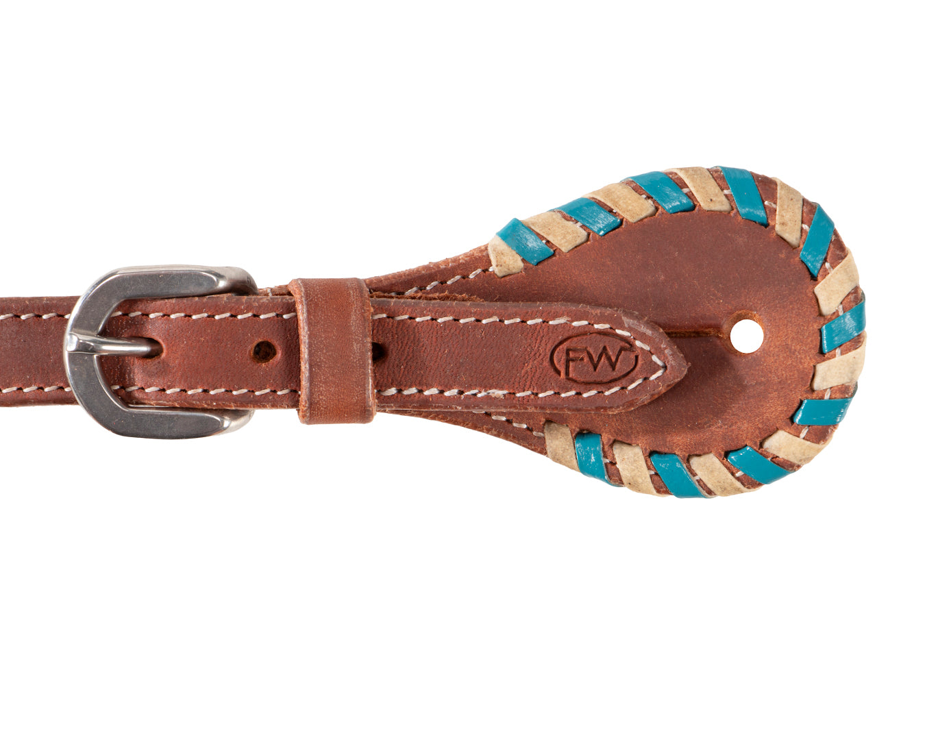 Introducing ‘Aponi’ these lovely spur straps are part of a matching set complete with a headstall, breastplate, and tie down noseband. The natural-colored premium leather, complemented by vibrant turquoise and natural rawhide accents, creates a striking contrast. Fort Worth ensure spur straps are crafted from the same top-quality leather used for all their riding tack.