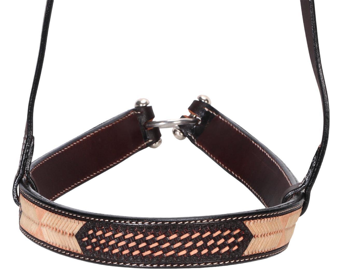 Meet ‘Cochise’, part of the newest additions to the Fort Worth range. This tie down noseband is handcrafted from carefully selective leather. The two-tone noseband is adorned with basketweave tooling, complemented by decoratively stitched raw-hide. The Cochise noseband is part of a matching set complete with a breastplate, headstall and spur straps.