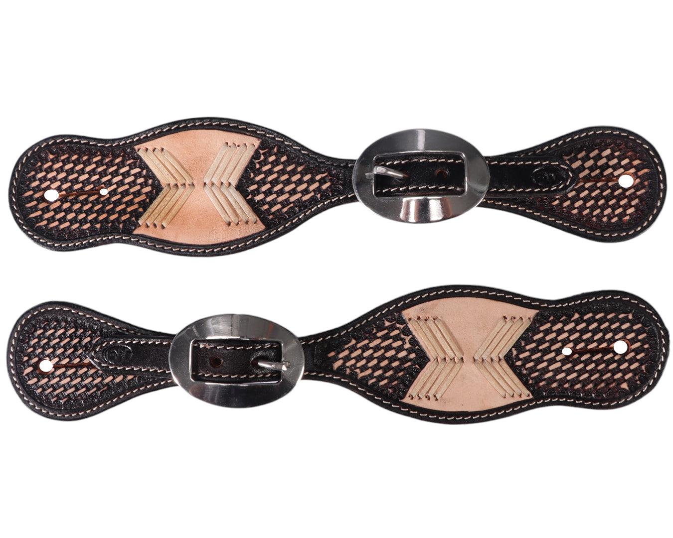 Meet ‘Cochise’, part of the newest additions to the Fort Worth range. These spur straps are handcrafted from carefully selective leather. The two-tone leather is adorned with basketweave tooling, complemented by decoratively stitched raw-hide. The Cochise spur straps are part of a matching set complete with a breastplate, headstall and tie down noseband.