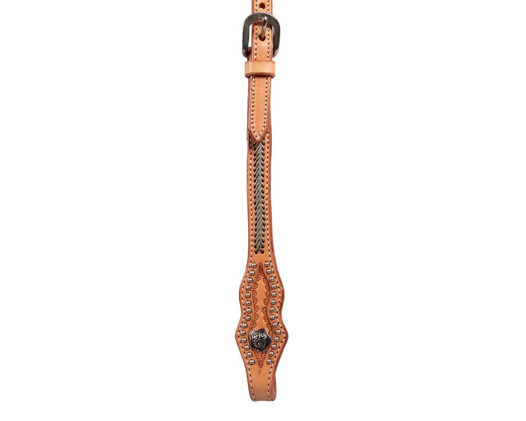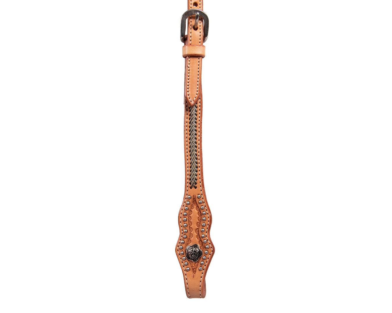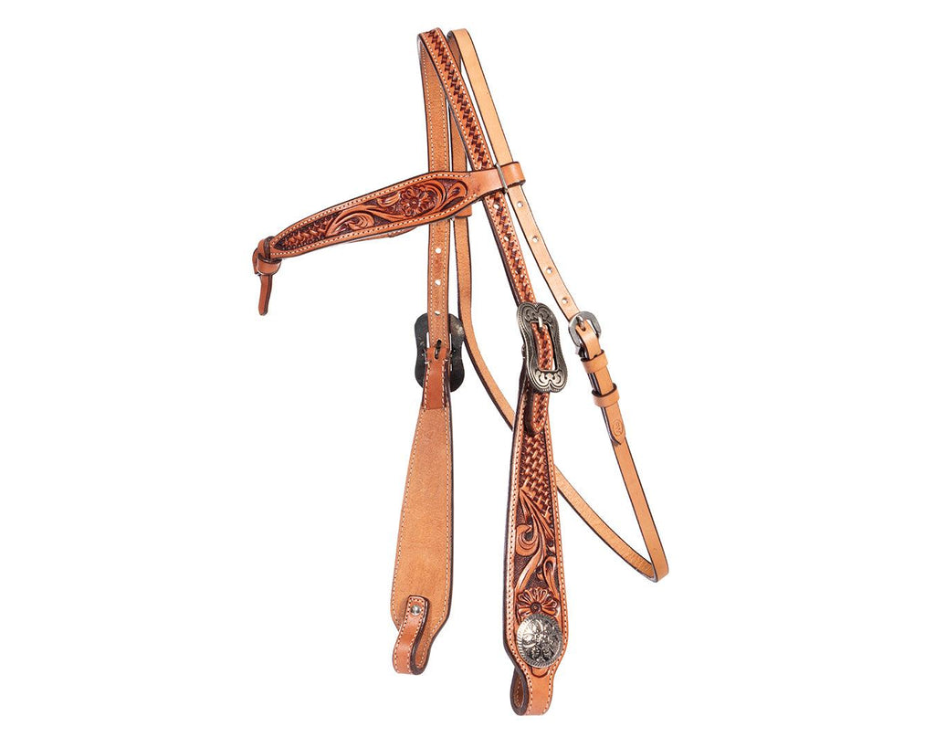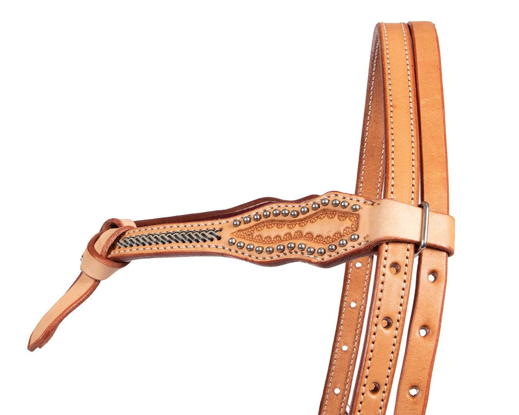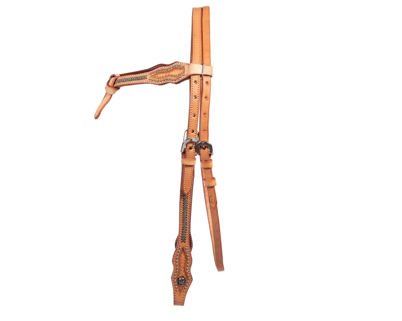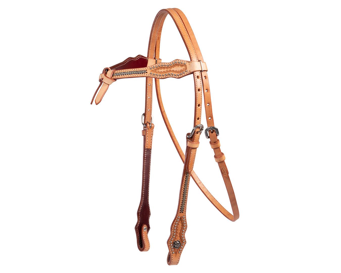 Crafted in beautiful sandy-hued leather, this quality bridle in striking Santa Fe style has colourful stitching and stud detailing. The knotted front brow gives that little bit of extra individuality, and it’s made carefully to ensure your horse can move in complete comfort and safety.